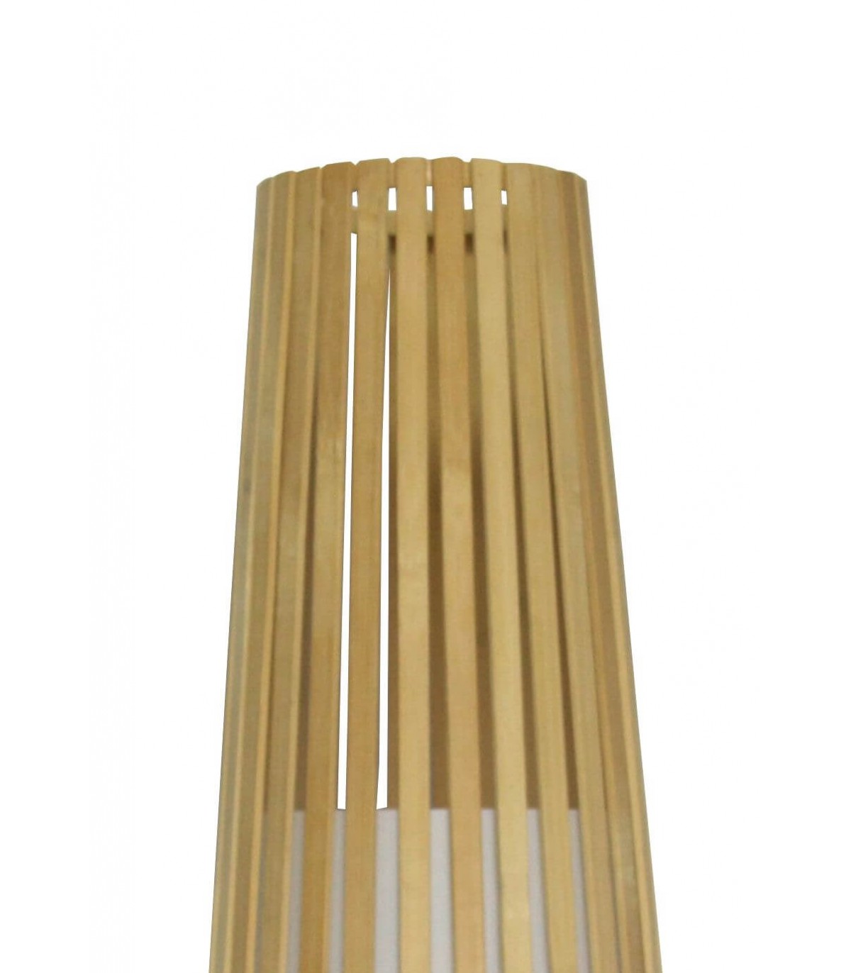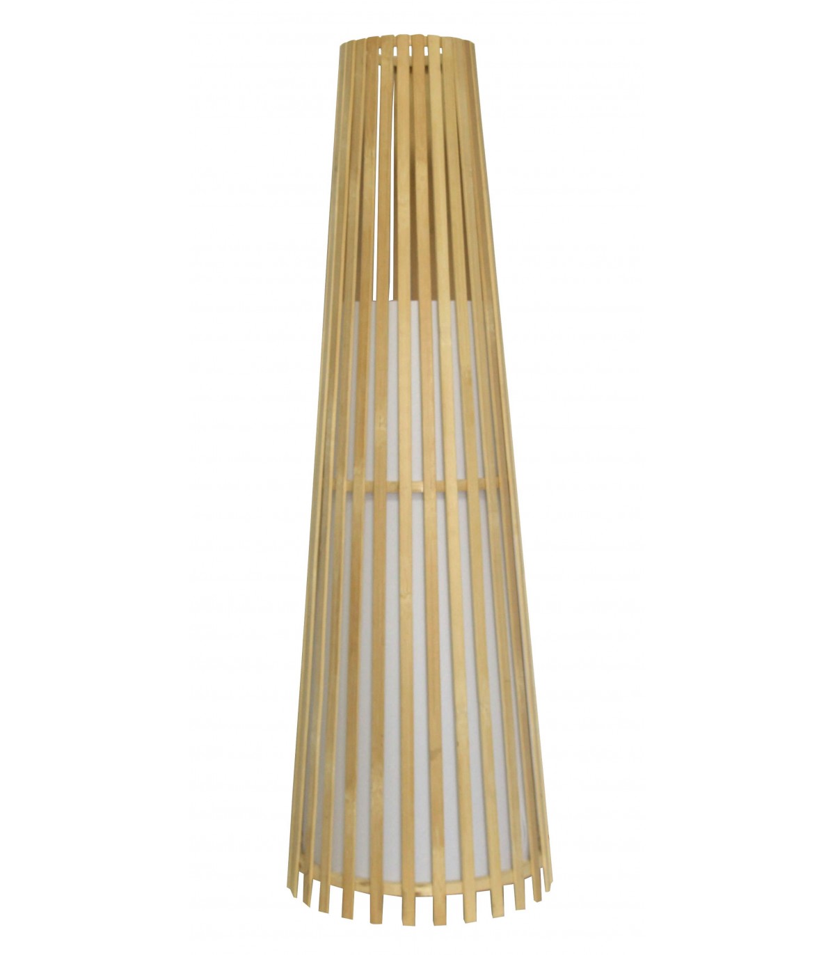 Lámpara de pie realizada en bambú y pergamino. Se compone de un cuerpo de bambú inspirado en una chimenea o farol japonés, de líneas sencillas, color natural y duradero. El diseño original de sus formas transmite tranquilidad y equilibrio a la atmosfera que ilumina, acorde con varios estilos de decoración como el minimalista, nórdico u oriental. La disposición de sus varillas y su pantalla interior de pergamino, difuminan la luz la luz creando un ambiente cálido y acogedor, también característico de las zonas mediterráneas avocadas al descanso y la meditación, utilizándose también este estilo para relajar zonas de trabajo y hogares