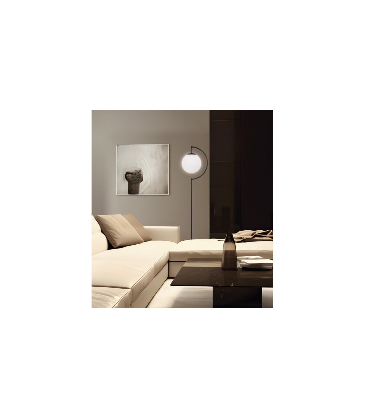 Lámpara de pie moderna realizada en metal color negro y una bola de cristal blanco con cierto aire art decó, una lámpara de ambiente ideal.
