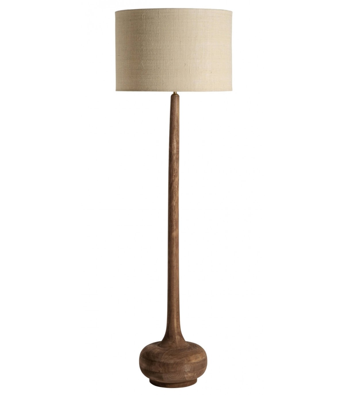 Lámpara de pie grande, con el pie realizado en madera de mango acabado artesanalmente en color nogal, con la pantalla confeccionada en yute color natural, una lámpara de estilo colonial, ideal para darle un toque elegante y cálido a tu rincón de lectura.