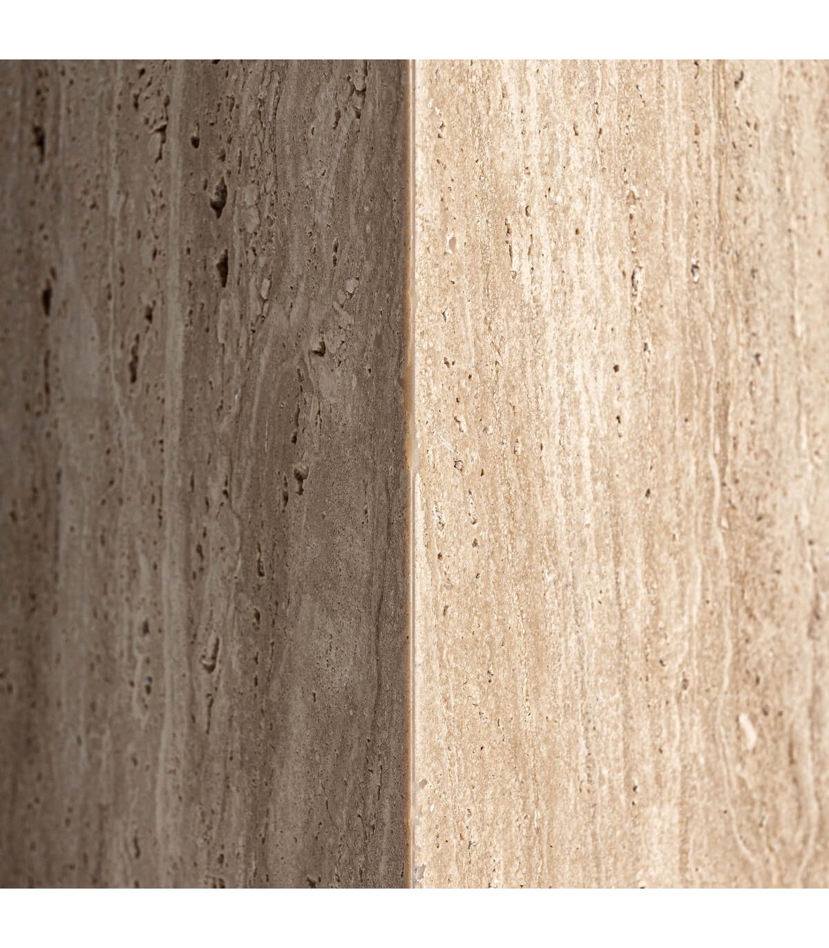 - Acabado, travertino natural a poro abierto con aplicaciones de bronce, pantalla boucle blanco.