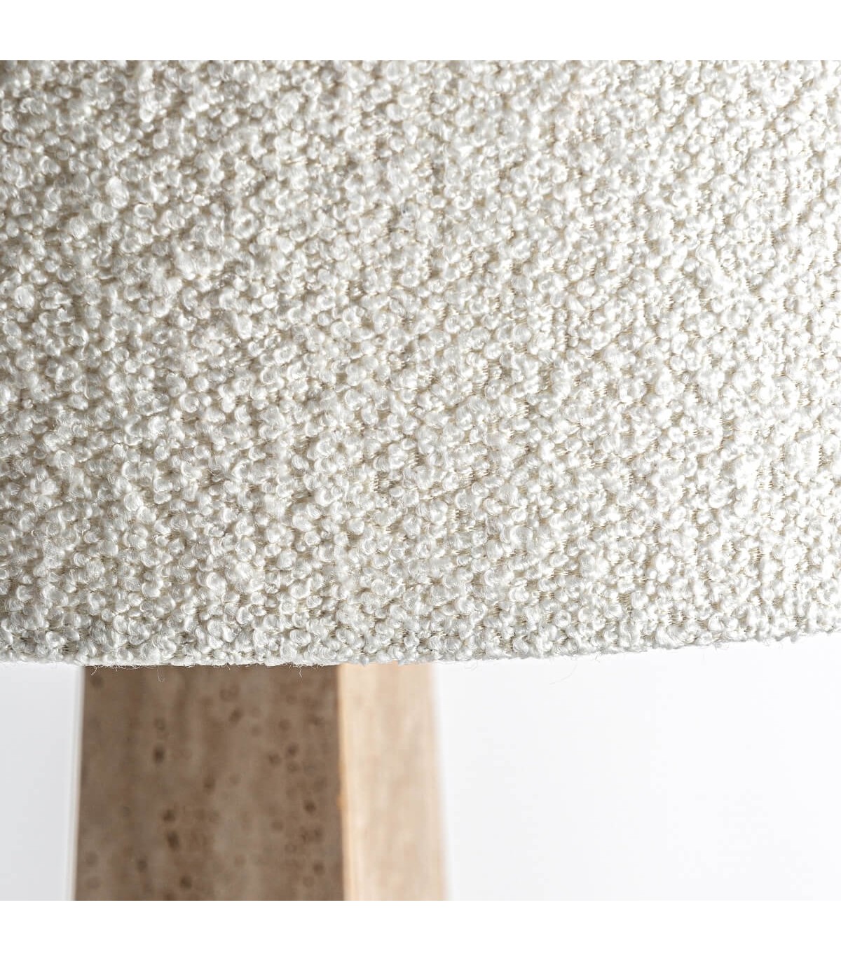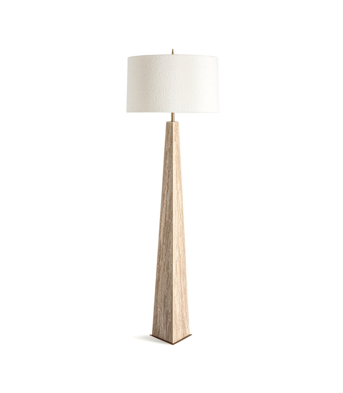 Lámpara de pie grande, con el pie realizado en travertino natural a poro abierto con aplicaciones de bronce, pantalla boucle blanco, una lámpara de estilo art decó, ideal para darle un toque elegante y sofisticado a tu ambiente.
