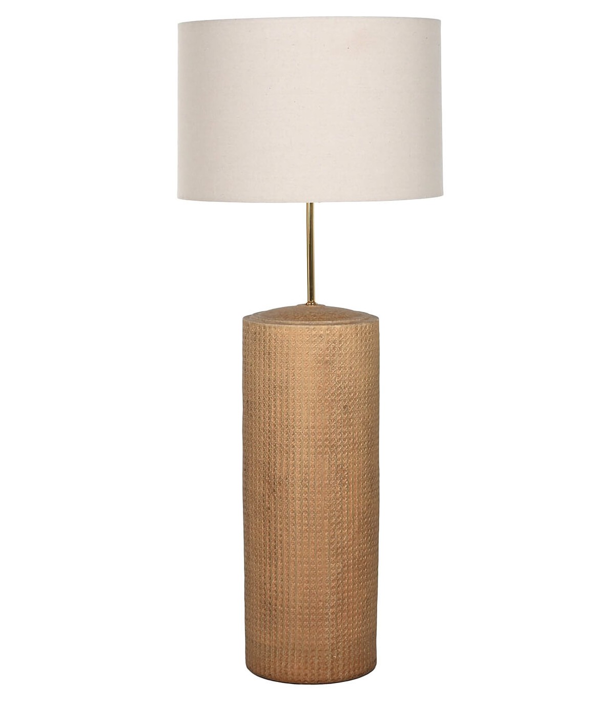• Acabado, base de cerámica imitación ratán acabado vintage, pantalla lino crudo.