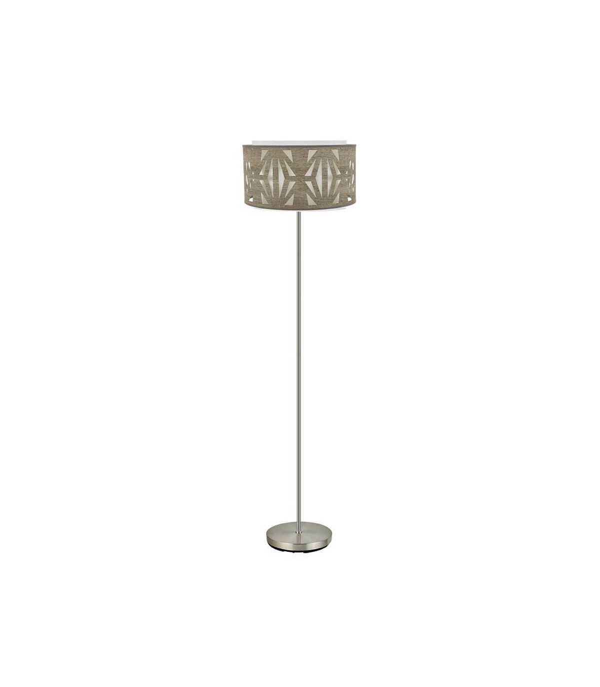 Lámpara de pie serie realizada en metal y textil, se caracteriza por el diseño moderno del dibujo que crea su pantalla calada, resultando una bonita composición para decorar e iluminar cualquier estancia del hogar o lugar de trabajo.
