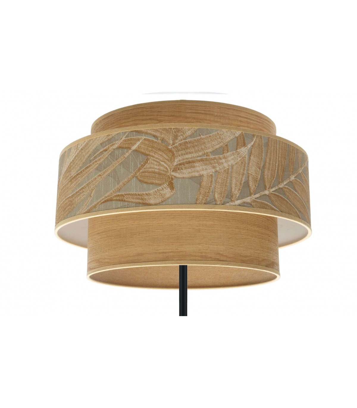 Lámpara de pie realizada en metal negro y textil. Su pantalla se compone de dos cuerpos ribeteados, con un bonito estampado decogarden en su pantalla superior, combinando el efecto madera con plantas, resultando una composición muy vistosa y original. De estilo moderno, pero con líneas sencillas, idóneo para ambientes decorados con los nuevos estilos de decoración en los que se mezclan elementos naturales con plantas, conectando con la naturaleza y añadiendo a la estancia que iluminan frescura y vitalidad. Muy combinable con estilos Boho e Industriales modernos pero dando un toque de elegancia a dormitorios, entradas, pasillos, comedores y zonas de trabajo.