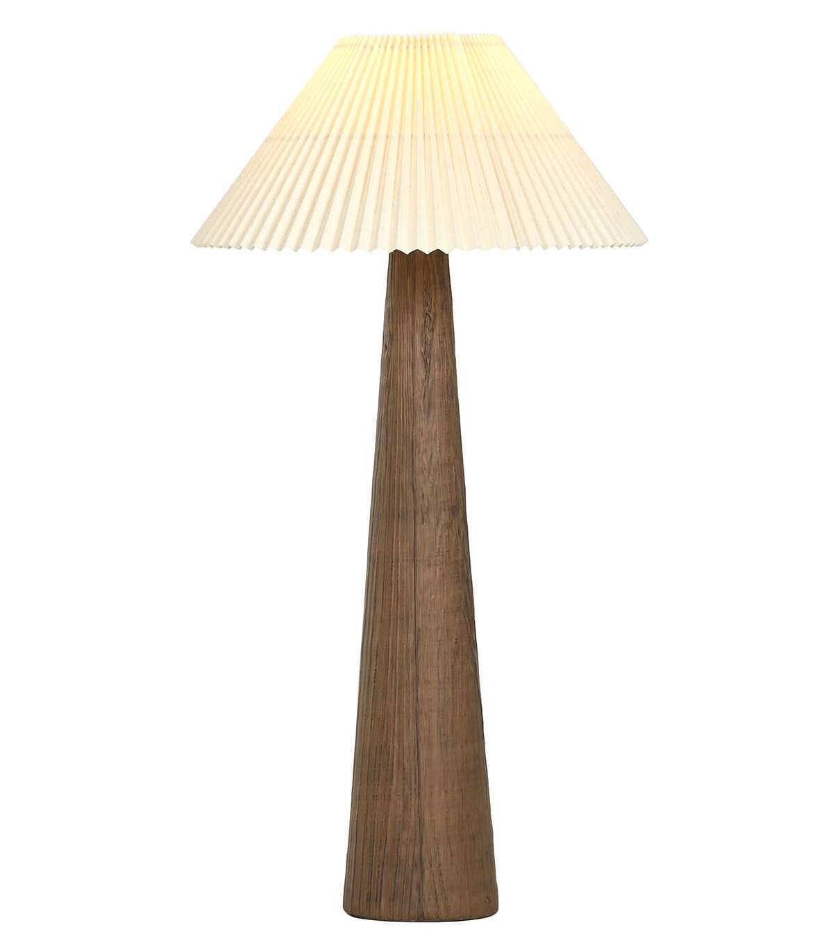 Diseño cálido y elegante para esta lámpara de pie de estilo rústico, con base cónica de cerámica imitación madera reciclada en tono nogal. Su estructura sobria se equilibra con una pantalla plisada en textil beige moteado, que aporta textura visual y un aire atemporal.