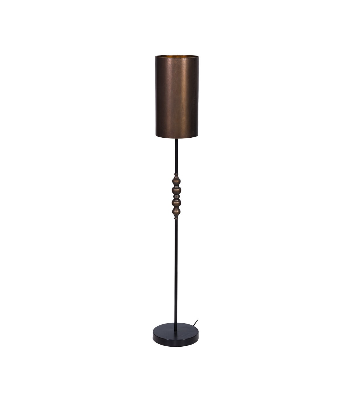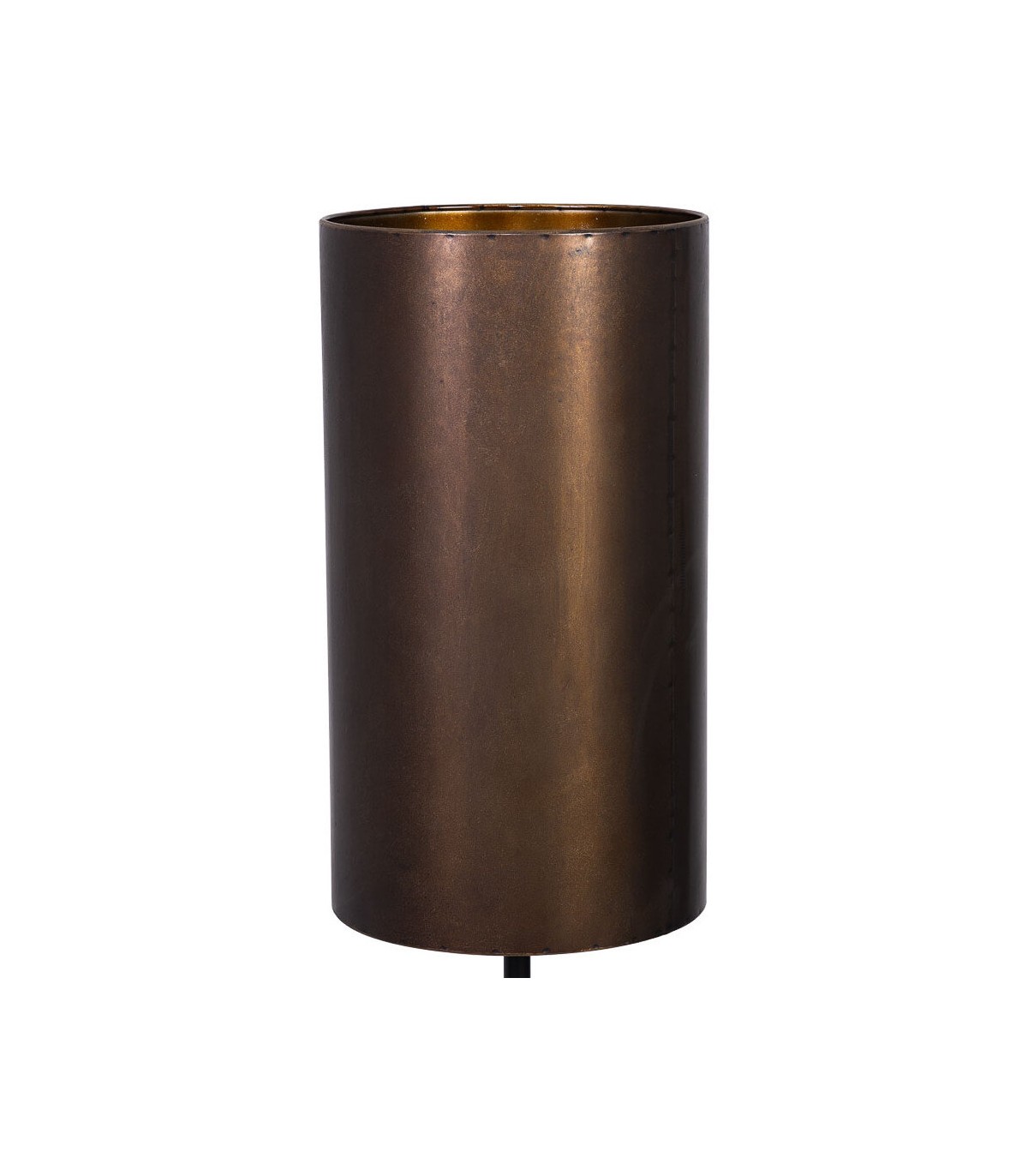 Lámpara de pie de líneas rectas y diseño cilíndrico, elaborada en metal con acabado bronce patinado envejecido. Su estructura delgada y el detalle ornamental central le dan un aire vintage sofisticado, ideal para espacios con estética industrial o clásica. Aporta una luz cálida y decorativa perfecta para salones, rincones de lectura o dormitorios con encanto.