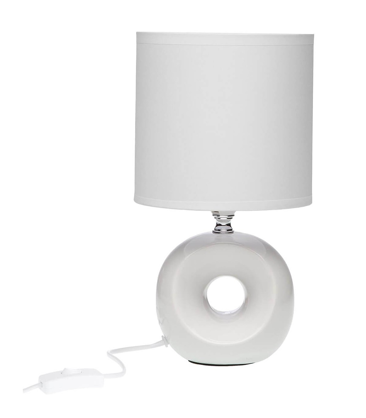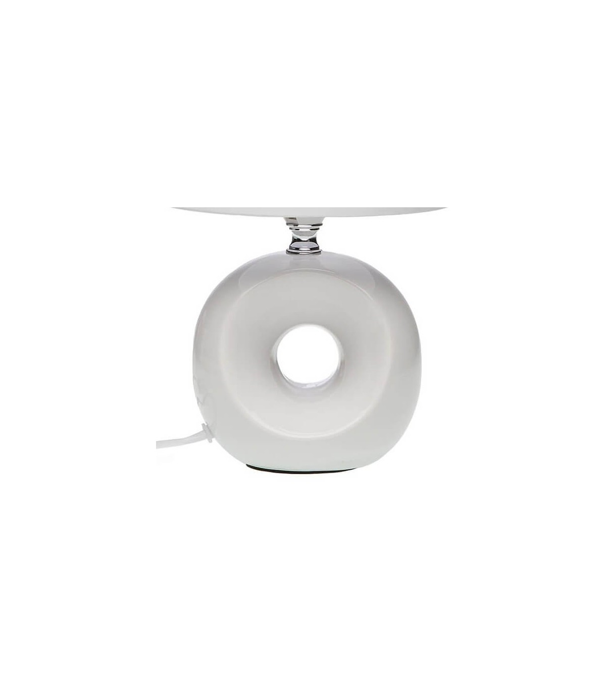 Esta lámpara de sobremesa mediana destaca por su diseño equilibrado y elegante, ideal para ambientes modernos y luminosos. La base de cerámica blanca, con forma circular y acabado brillante, refleja sencillez y pureza visual. Su pantalla textil ovalada difunde una luz suave y uniforme, perfecta para crear atmósferas acogedoras en dormitorios o salones.