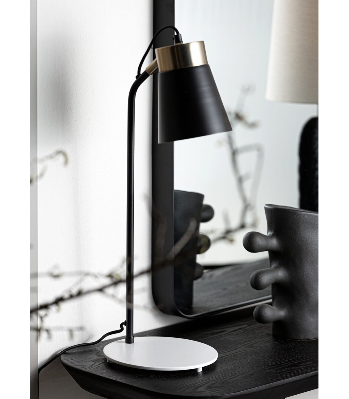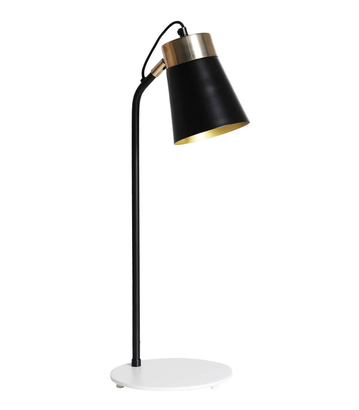 Bonita lámpara de sobremesa con la pantalla basculante realizada en metal blanco negro y dorado, perfecta para tu s mesitas de noche, le sacara todo el partido decorativamente a tu dormitorio, una vez encendida cambiará la estética de la estancia.