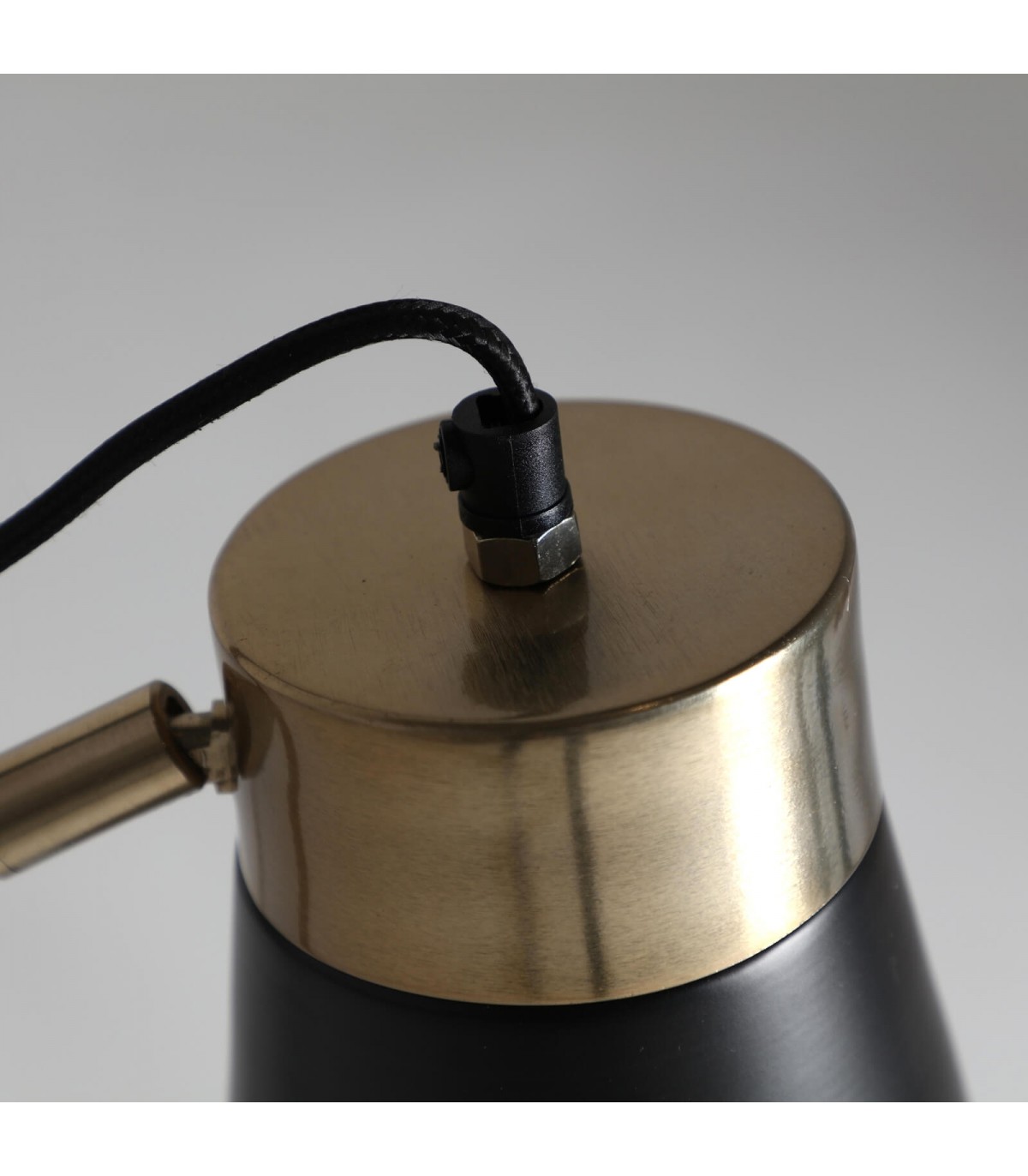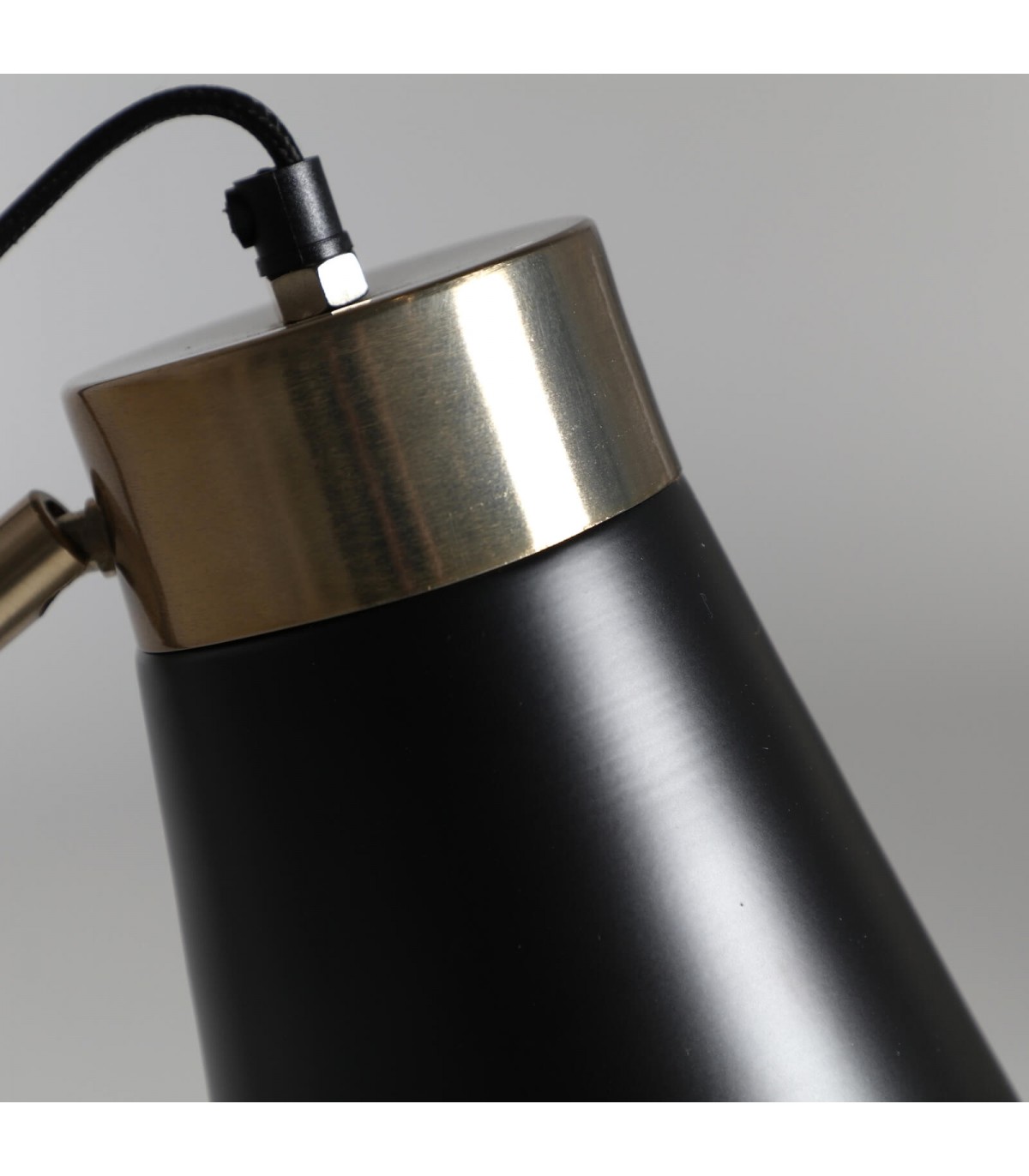 - Acabado, base blanca, fuste y pantalla negros con detalles en oro viejo.