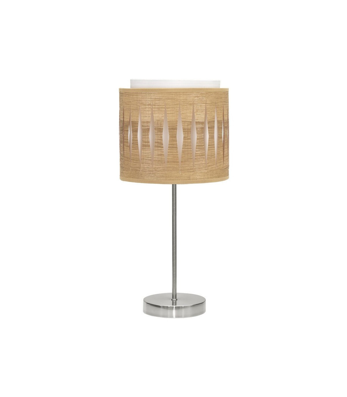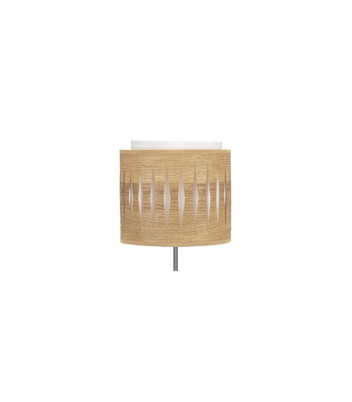 Lámpara de sobremesa de la serie Alexandra en color niquel y madera clara. Realizado en metal y textil. Se caracteriza por el diseño moderno del dibujo étnico que crea su doble pantalla calada y sus terminaciones simulando madera, resultando una bonita composición para decorar e iluminar en cualquier rincón del hogar o lugar de trabajo.