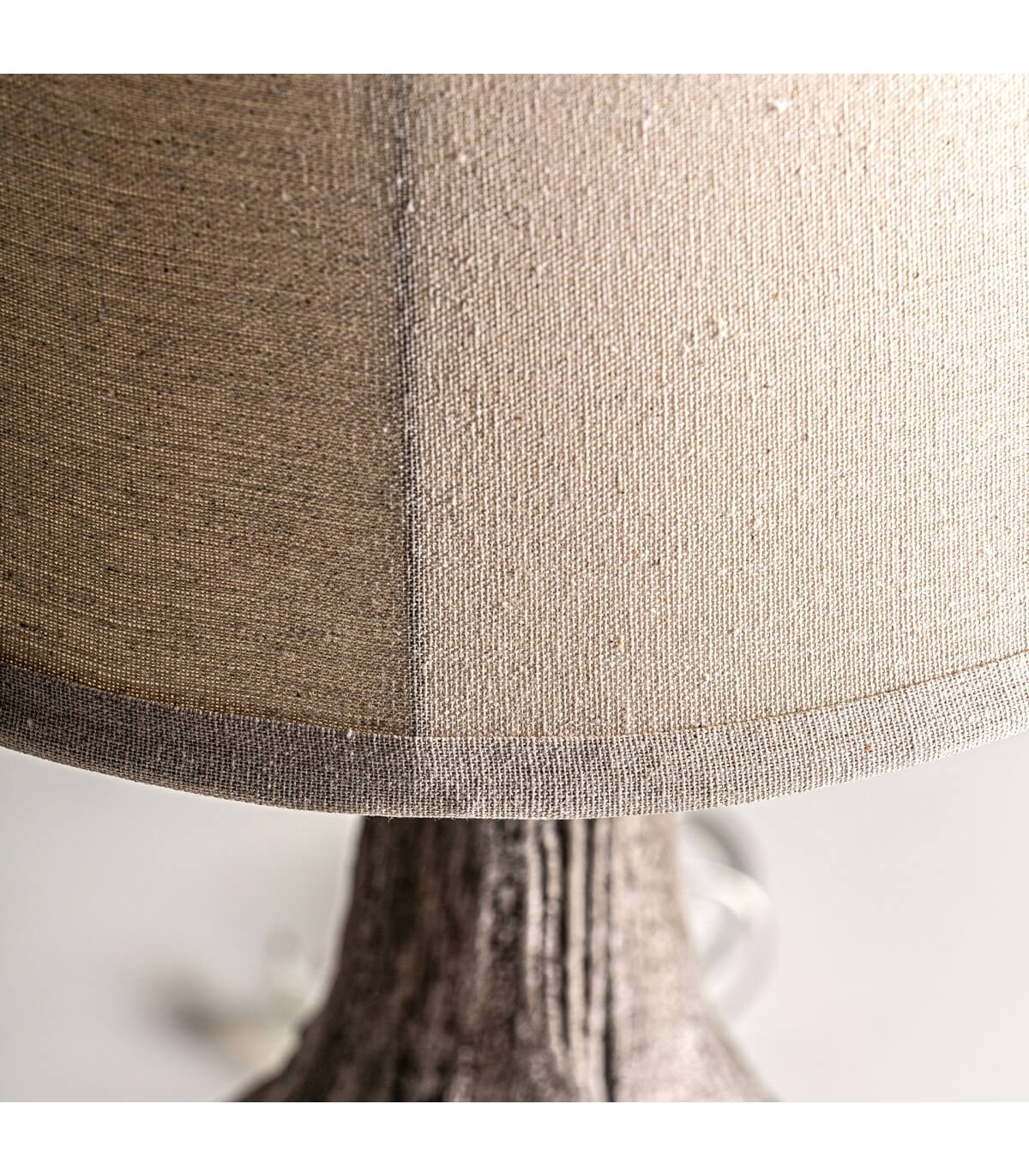 - Acabado, resina imitación madera tallada antigua, pantalla en yute color beige.