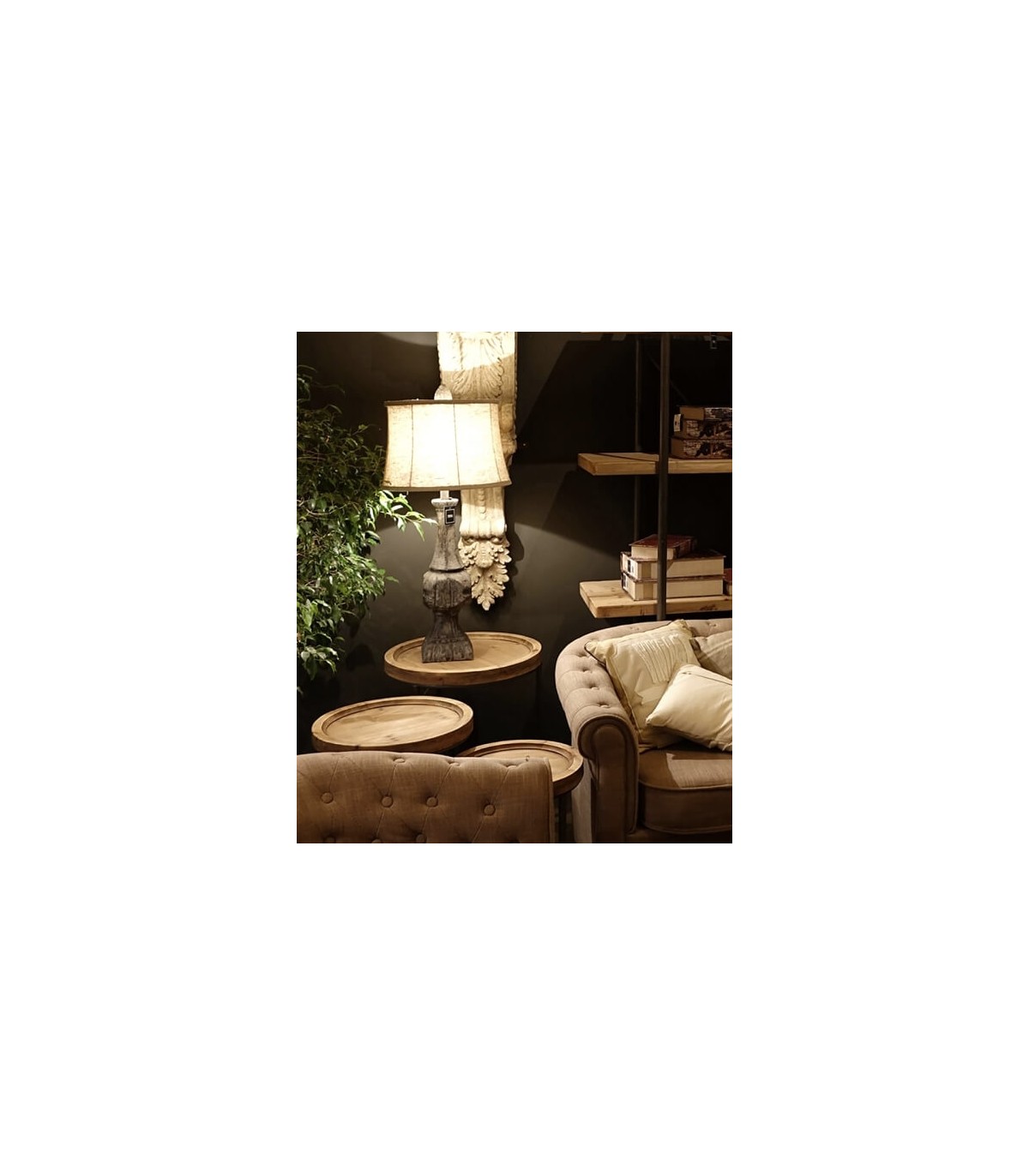 Aporta un toque de elegancia y distinción a tus espacios con esta lámpara de sobremesa alta, elaborada en resina que imita madera tallada antigua. Su diseño atemporal se combina con una pantalla en yute color beige, la cual emite una luz suave y acogedora, perfecta para crear ambientes cálidos y sofisticados.