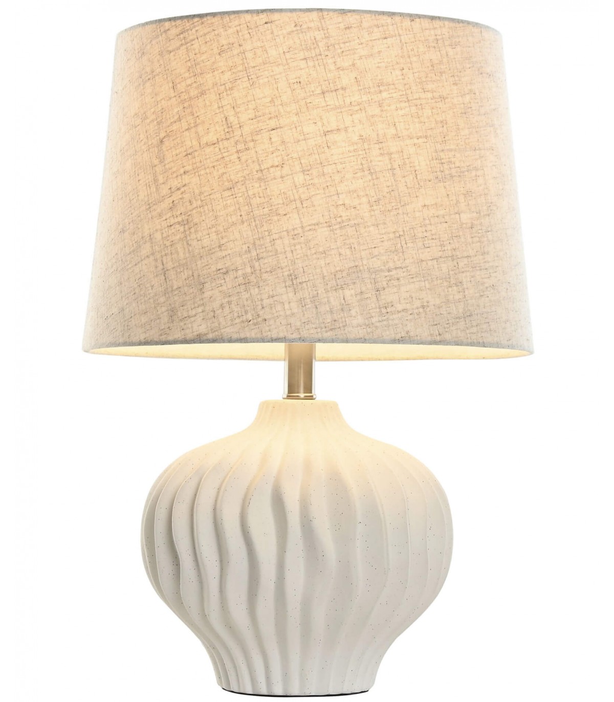 Lámpara de sobremesa de estilo ibicenco, con una base en cerámica ondulada acabado blanco roto y la pantalla en lino beige con detalles en metal cromado, recomendada para muebles de tamaño medido o grande.