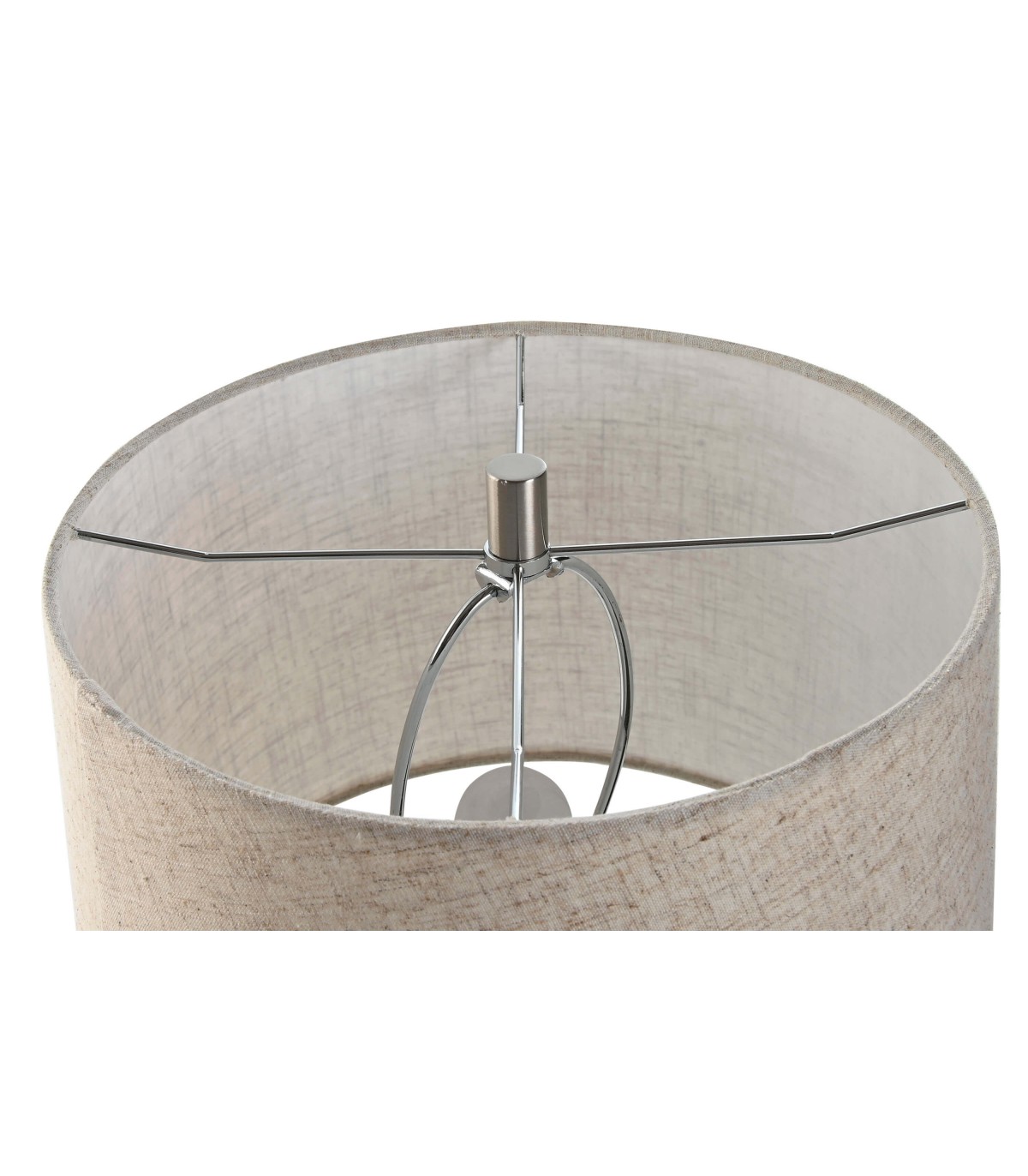 • Acabado, artesanal, cerámica en color blanco roto, metal cromado, pantalla en lino beige.