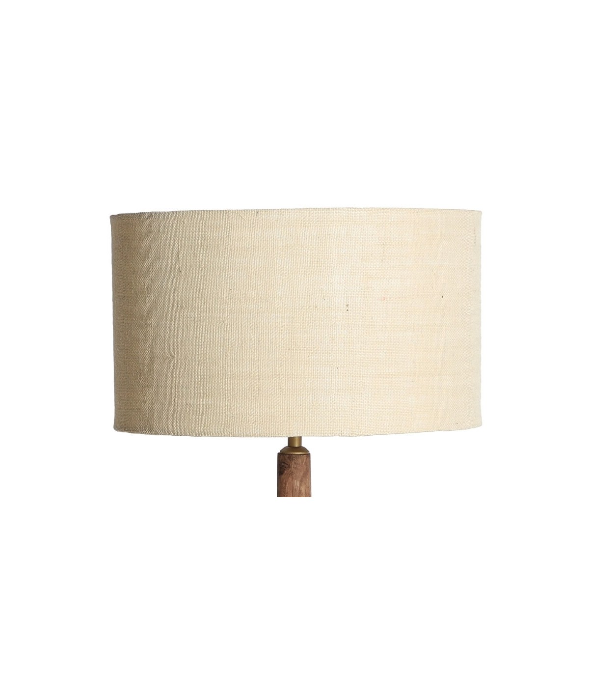 Lámpara de sobremesa grande, con el pie realizado en madera de mango acabado artesanalmente en color nogal, con la pantalla confeccionada en yute color natural, una lámpara de estilo colonial, ideal para muebles grandes. como aparadores o cómodas.