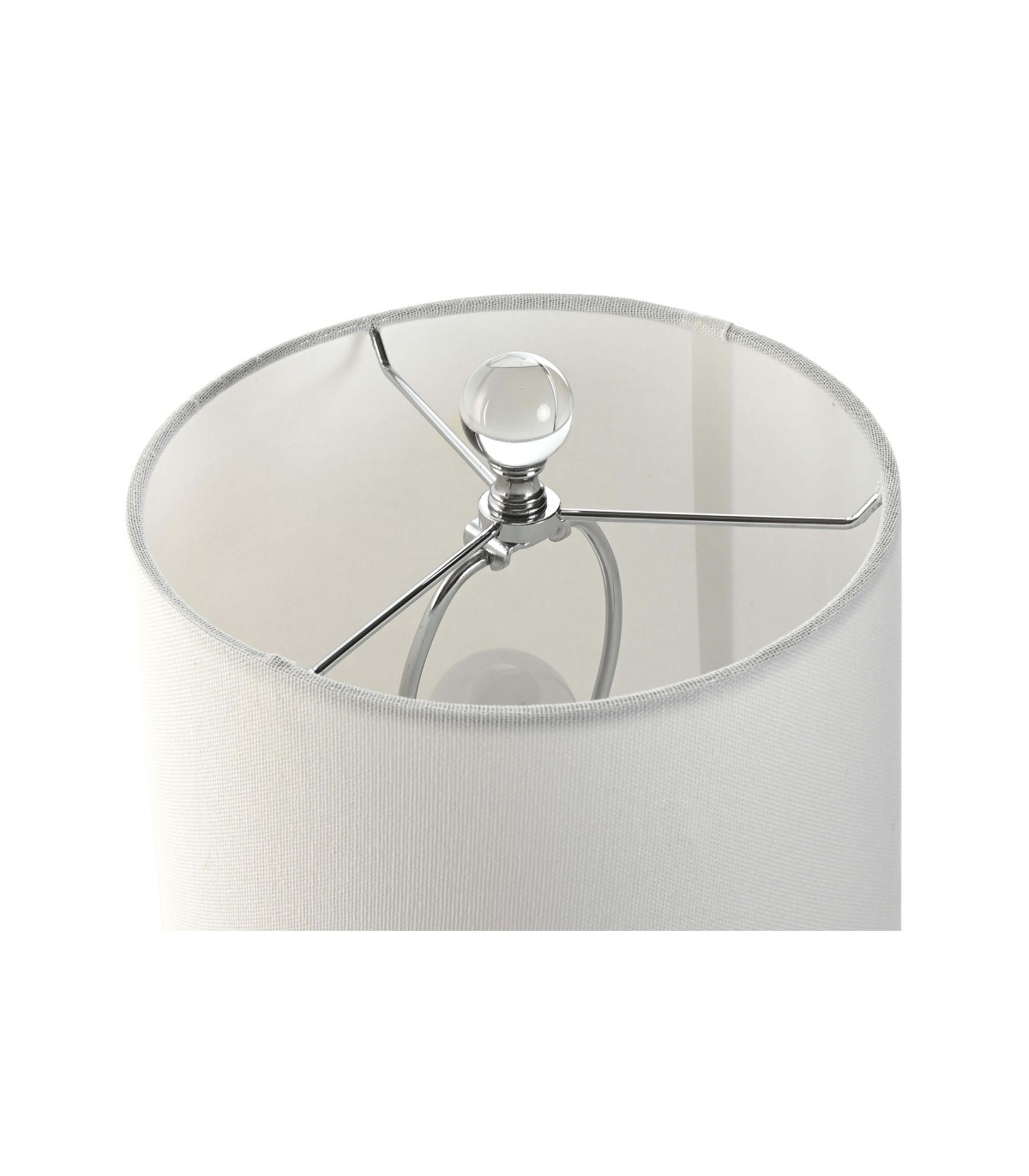 Lámpara de sobremesa, decorativa y funcional que destaca por su diseño refinado. Su base de cristal tallado con detalles en metal cromado refleja la luz de manera sutil, creando un efecto luminoso elegante y moderno. La pantalla de lino blanco filtra la luz de forma cálida y acogedora, perfecta para generar ambientes relajantes y sofisticados.