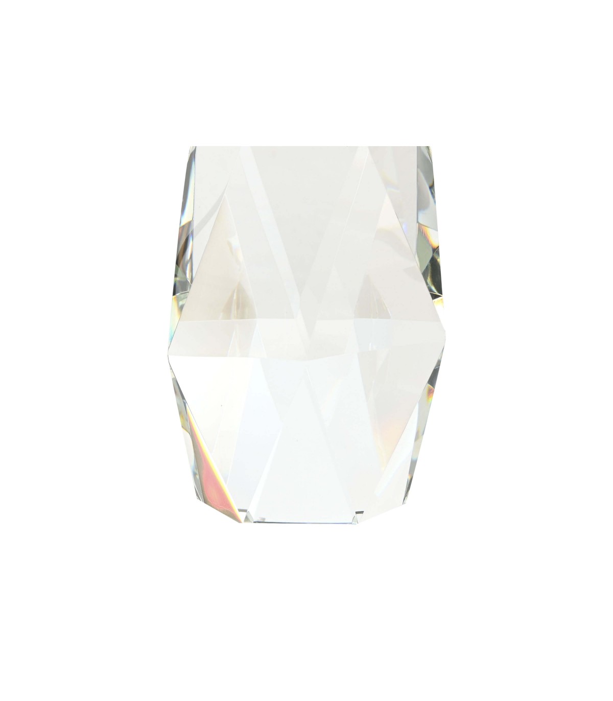 - Acabado, cristal transparente tallado, metal cromado, pantalla en lino blanco.