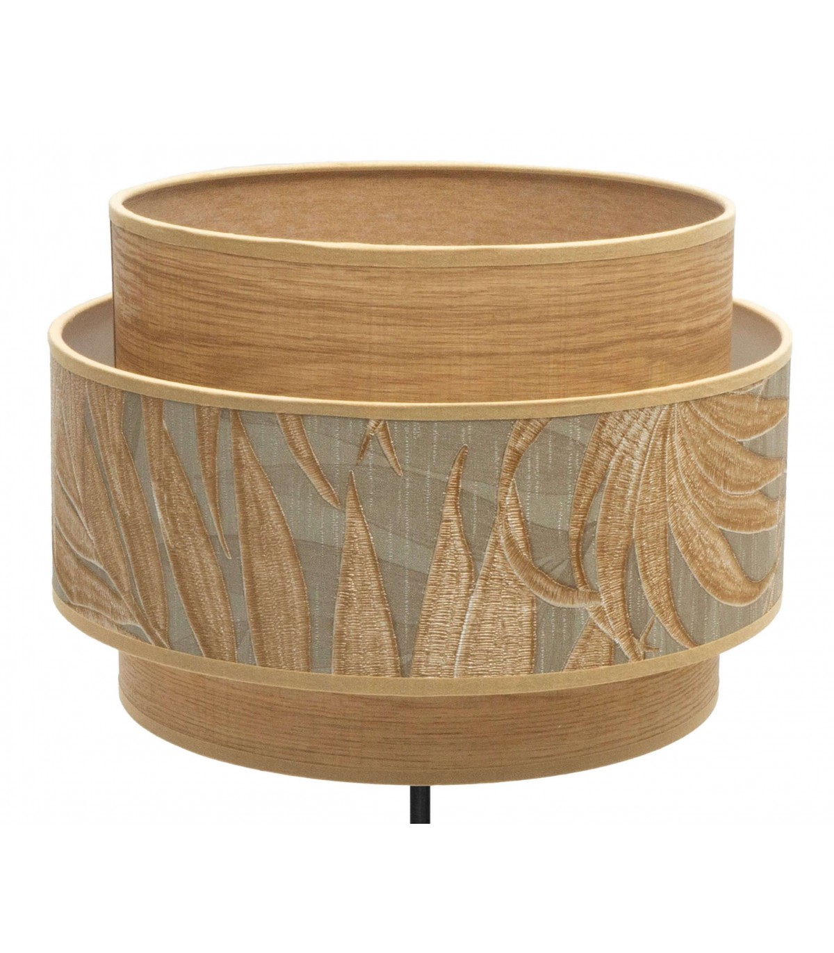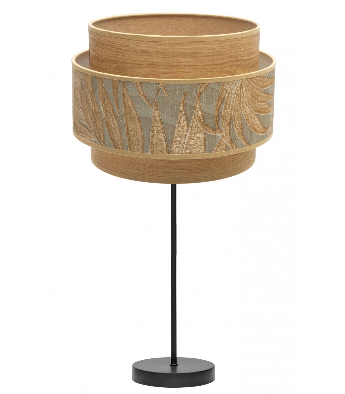 Lámpara de sobremesa realizada en metal negro y textil. Su pantalla se compone de dos cuerpos ribeteados, con un bonito estampado decogarden en su pantalla superior, combinando el efecto madera con plantas, resultando una composición muy vistosa y original. De estilo moderno, pero con líneas sencillas, idóneo para ambientes decorados con los nuevos estilos de decoración en los que se mezclan elementos naturales con plantas, conectando con la naturaleza y añadiendo a la estancia que iluminan frescura y vitalidad. Muy combinable con estilos Boho e Industriales modernos pero dando un toque de elegancia a dormitorios, entradas, pasillos, comedores y zonas de trabajo.