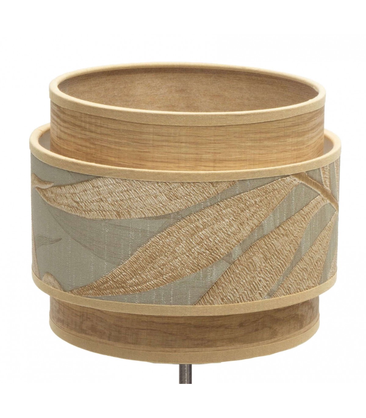 Lámpara de techo realizada en metal oro viejo y textil. Su pantalla se compone de dos cuerpos ribeteados, con un bonito estampado deco garden en su pantalla superior, combinando el efecto madera con plantas, resultando una composición muy vistosa y original.