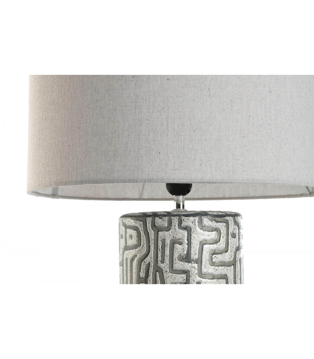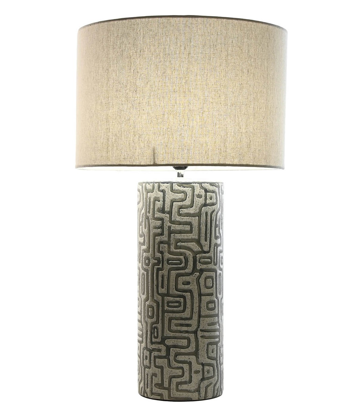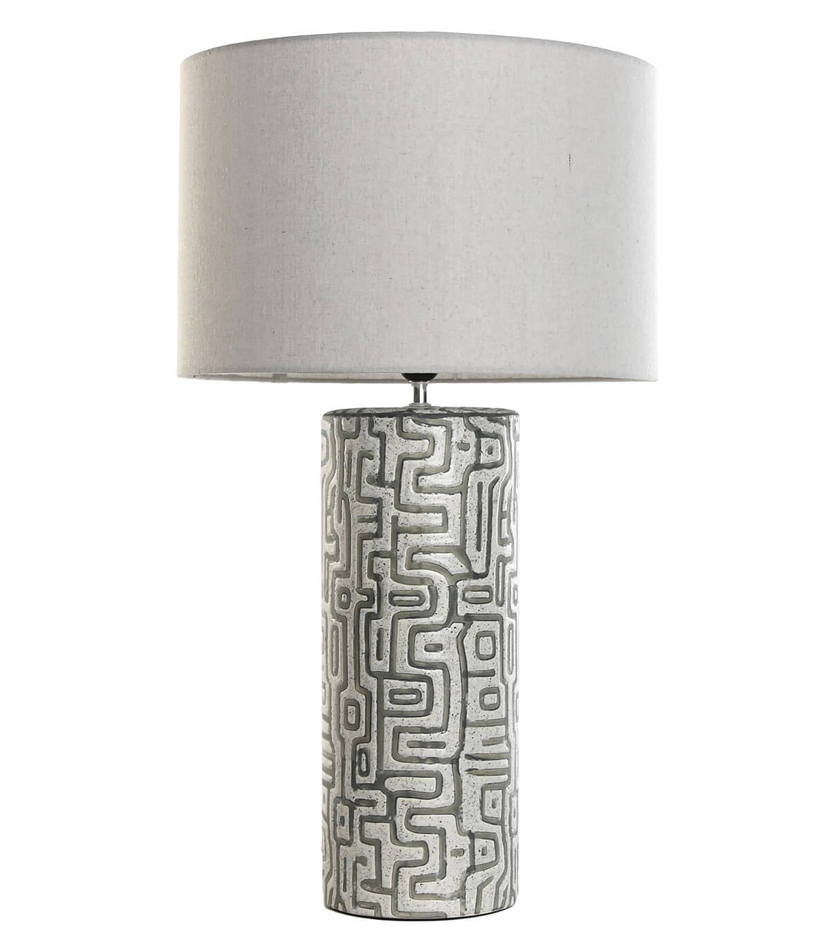 Esta lámpara de sobremesa alta destaca por su diseño único y elegante. La base de cerámica presenta dibujos geométricos inspirados en las misteriosas líneas de Nazca, en tonos grises que aportan un toque contemporáneo y sofisticado a cualquier espacio. La pantalla en lino color blanco roto suaviza la luz, creando un ambiente acogedor y relajante.