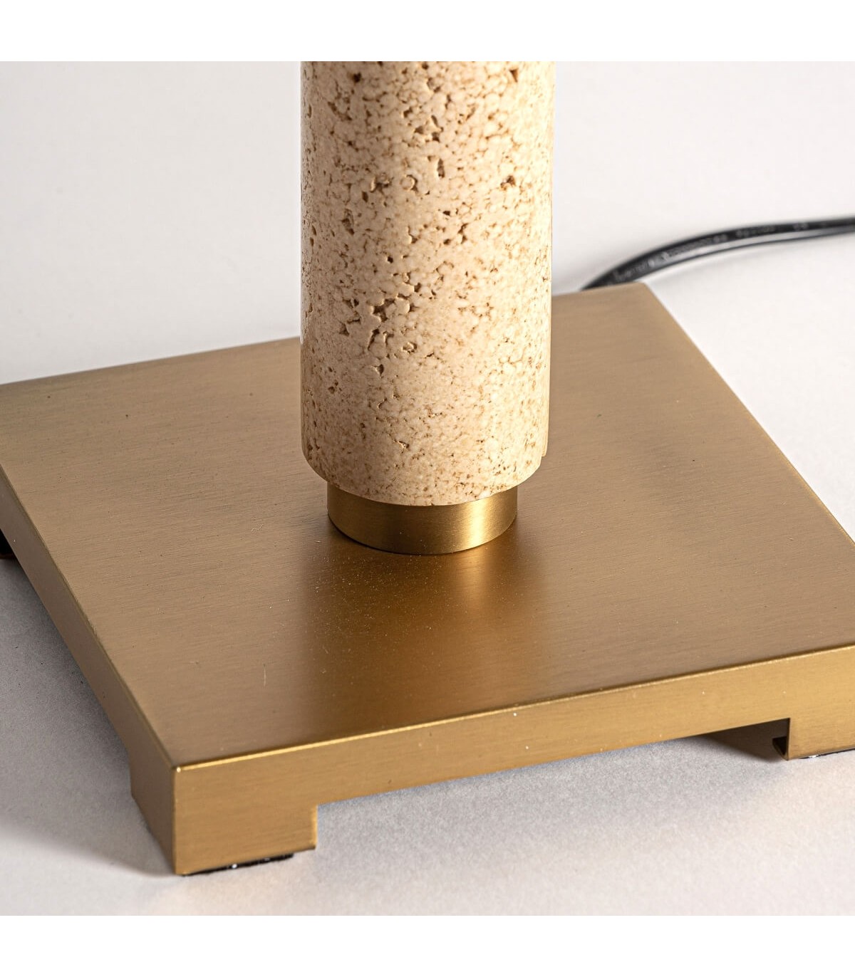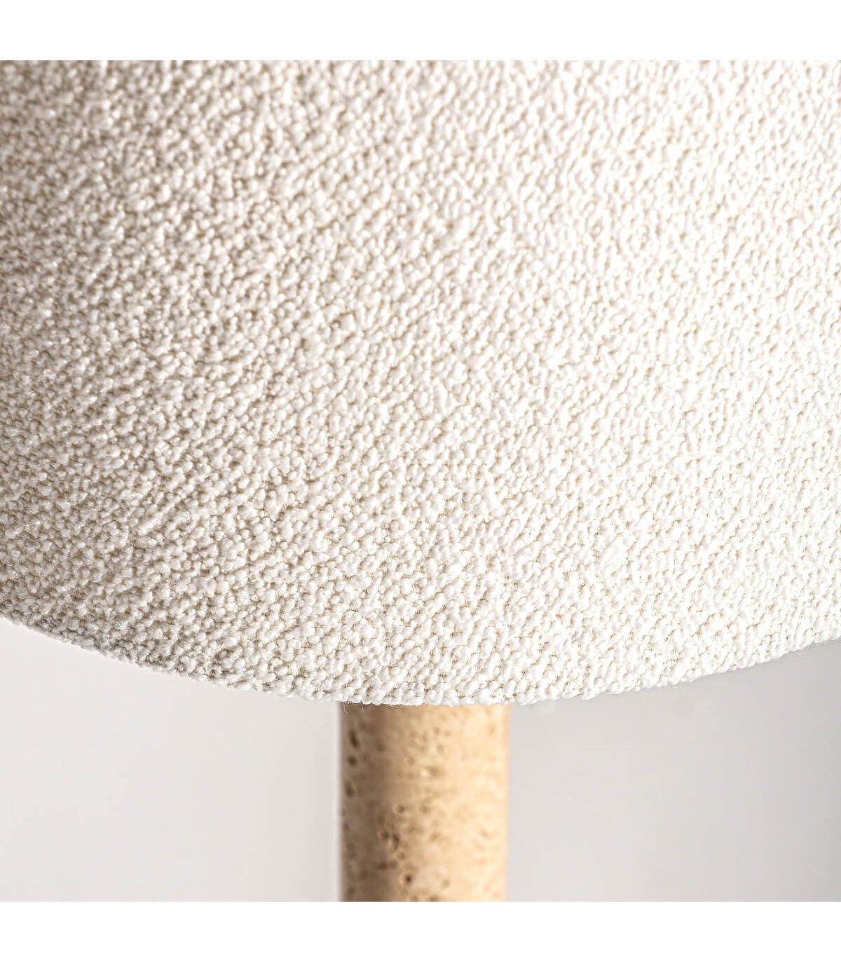 🎨 Acabado: Mármol beige natural, base dorada y pantalla en bouclé blanco roto