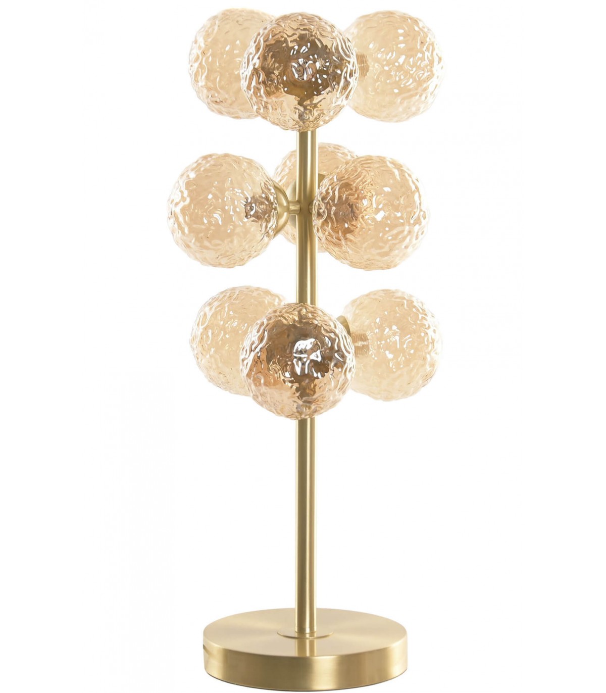Esta lámpara de sobremesa destaca por su diseño escultórico de nueve tulipas esféricas en cristal corrugado ámbar que difunden una luz cálida y envolvente. Su base y estructura metálica dorada aportan un aire sofisticado y refinado, evocando la elegancia del art decó.