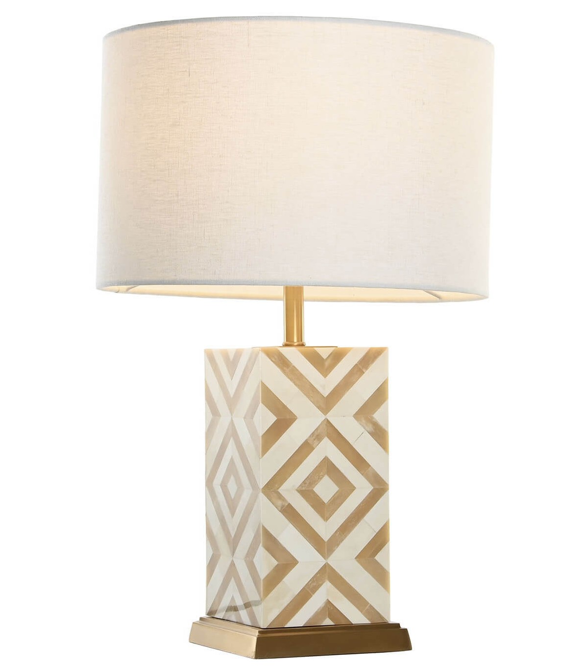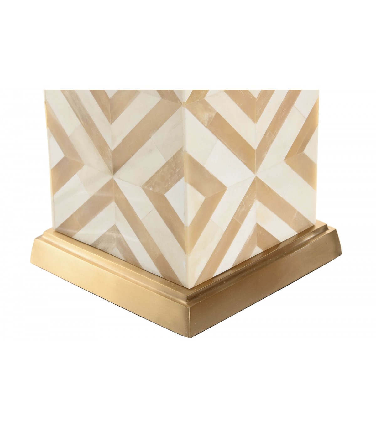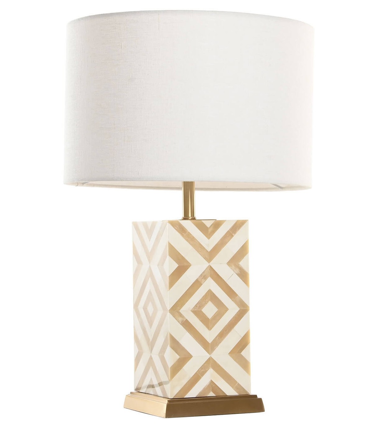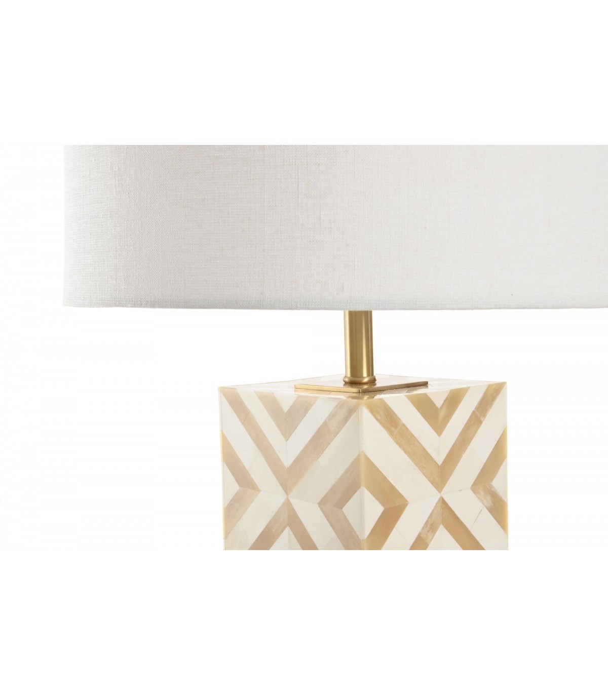 Ilumina tus espacios con carácter y sofisticación gracias a esta exclusiva lámpara de sobremesa de inspiración art decó. Confeccionada artesanalmente en hueso natural combinado con latón dorado y una elegante pantalla de algodón blanco, destaca por su base geométrica que aporta un efecto visual único.