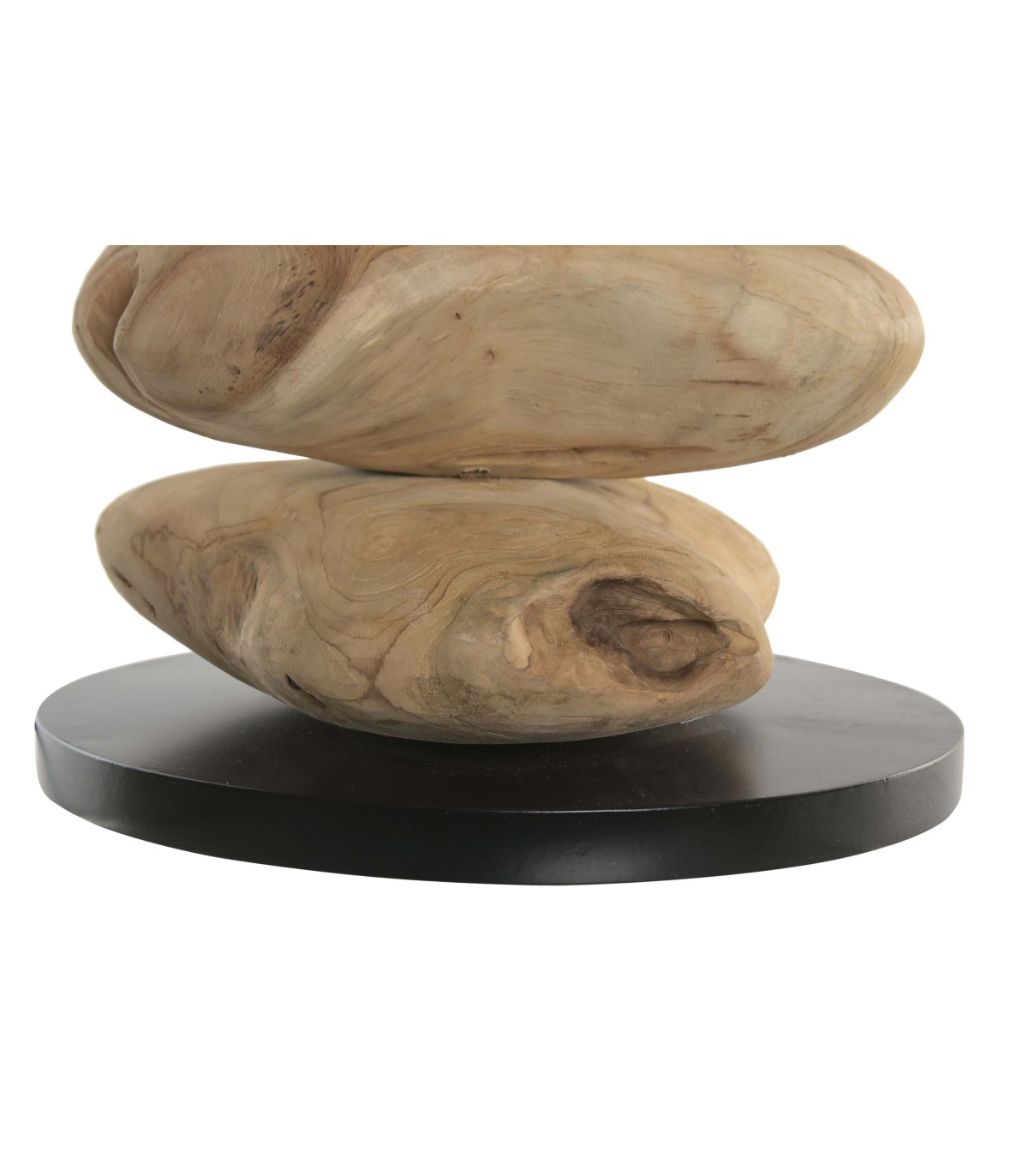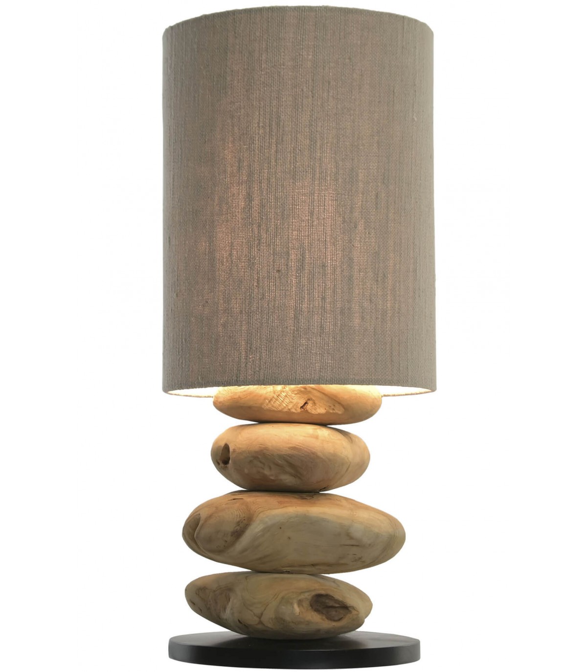 Lámpara de sobremesa de gran formato fabricada artesanalmente en madera maciza de teca con base metálica negra y pantalla de lino color topo. Su pie escultórico formado por piezas naturales apiladas refleja la belleza irregular de la madera y la autenticidad del trabajo manual.