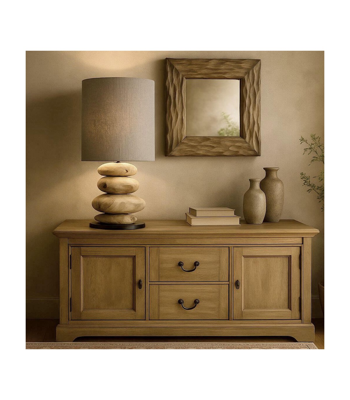 🎨 Acabado: Pie madera natural, base metal negro, pantalla lino topo. Fabricación artesanal, entendemos las variaciones de tonalidad, tamaño y forma o ciertas imperfecciones (grietas, nudos, marcas) como un valor añadido que la convierten en pieza única.