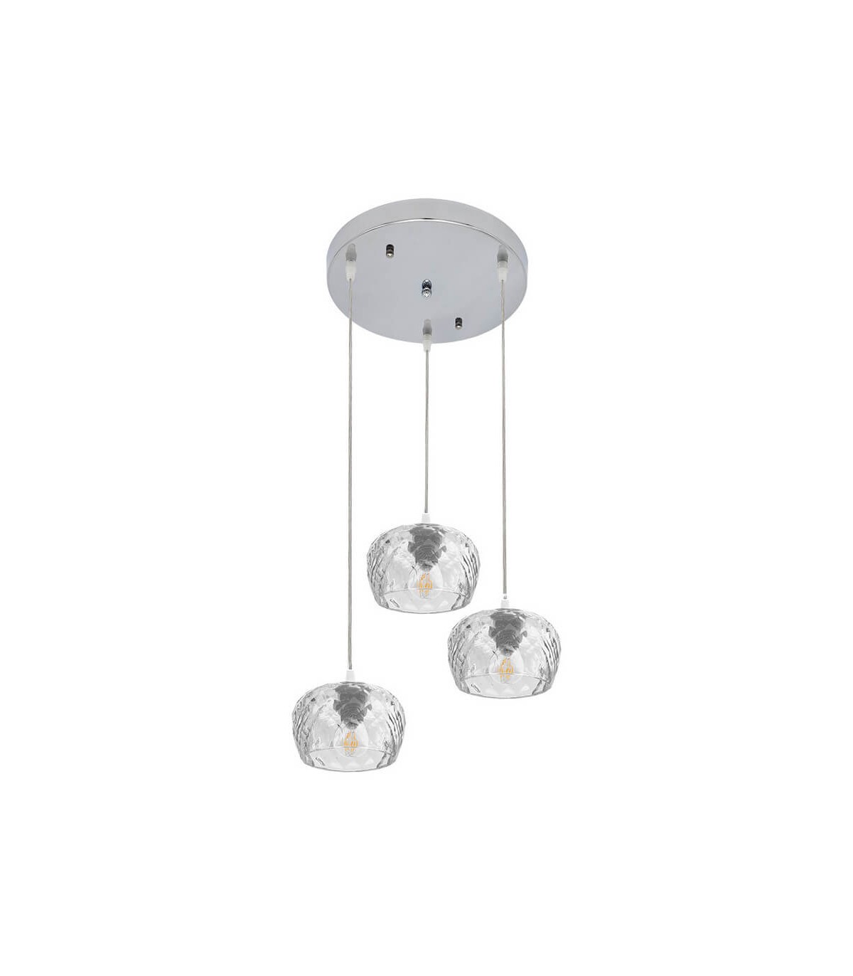 Plafón de tres luces de la serie Setela. Destaca por el diseño moderno y original de sus tulipas de cristal tallado, pudiendo dejarlas suspendidas a la misma o a diferentes alturas, resultando una bonita composición muy decorativa para dormitorios, comedores, salones y salas de estar e incluso para zonas de trabajo decoradas con estilo moderno, encajando también muy bien en ambientes decorados con los nuevos estilos Industrial, Vintage y Shabby Chic, mezclando diferentes texturas y estilos. En esta serie podemos encontrar varias piezas como lámparas, colgantes, plafones y regletas, en cuero, cromo, marrón ó blanco, de una, dos, tres y cuatro luces, pudiendo combinar elementos y a diferentes alturas, para que elija entre una gran variedad de combinaciones, la que más se adapte a sus gustos y necesidades.