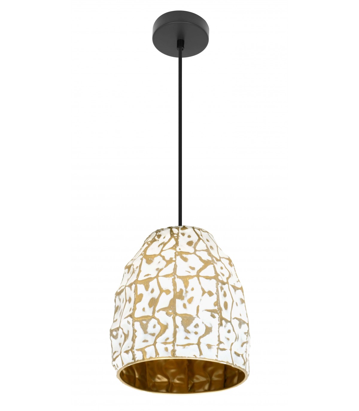 Lampara de techo la pantalla realizada en metal oro y blanco. Se caracteriza por su diseño y forma muy original y decorativo, su pantalla de metal tallado y el contraste del blanco con el oro aportan un toque de lujo elegante y distintivo, dando personalidad y encanto a la estancia que ilumina. Ideal para estancias decoradas con los nuevos estilos como el Glam Clásico, Vintage o minimalista o simplemente transmitiendo calidez y satisfacción en un ambiente sencillo y discreto.
