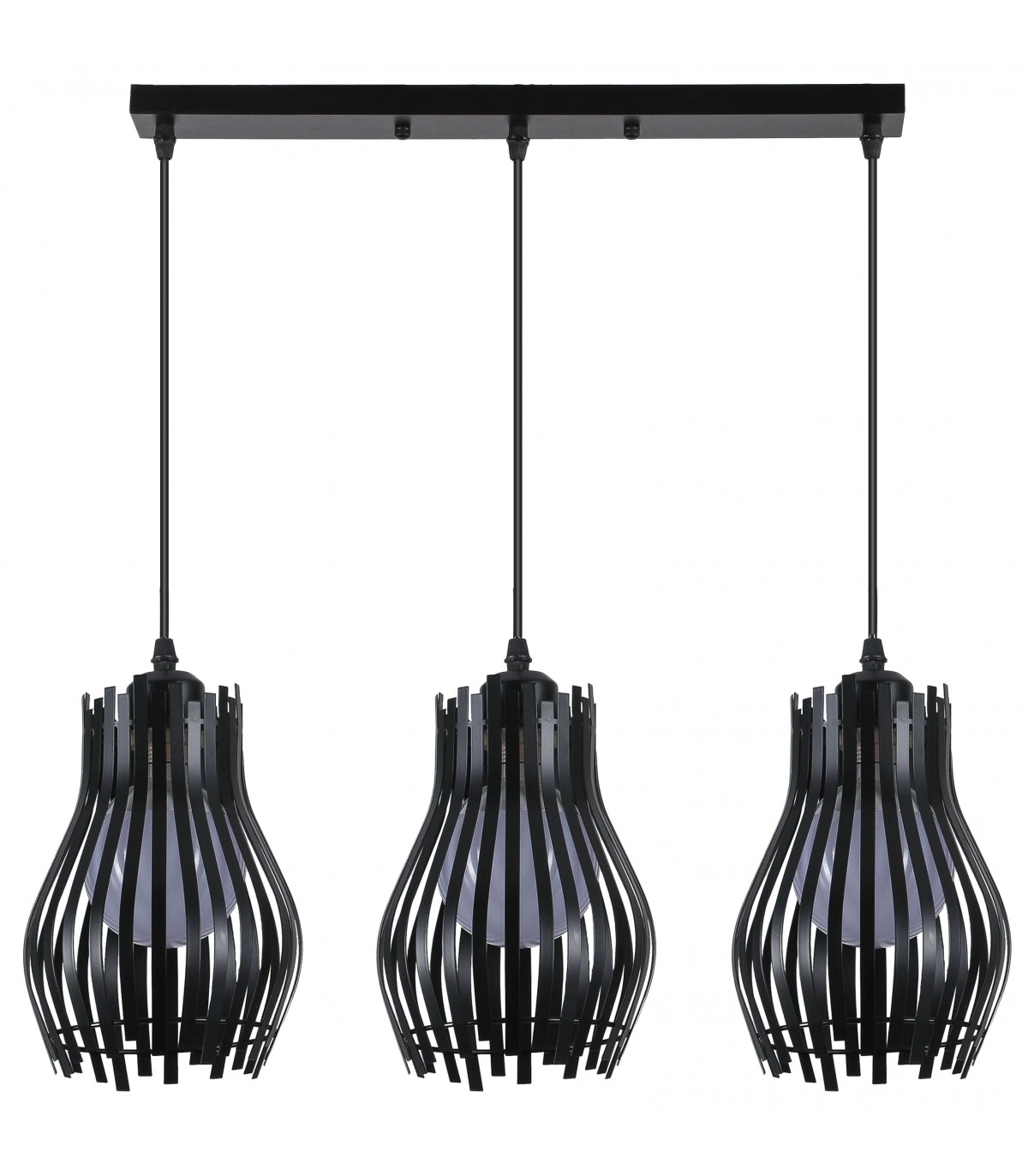 Lampara de techo con 3 pantallas realizadas en metal negro regulables en altura individualmente, La luz pasa a través de los huecos de sus tulipas describiendo un juego de luces muy decorativo ideal para salones y salas de estar e incluso para zonas de trabajo decoradas con diversos estilos de decoración, como pueden ser el Industrial o el Vintage Rústico, tomando parte importante de la decoración.