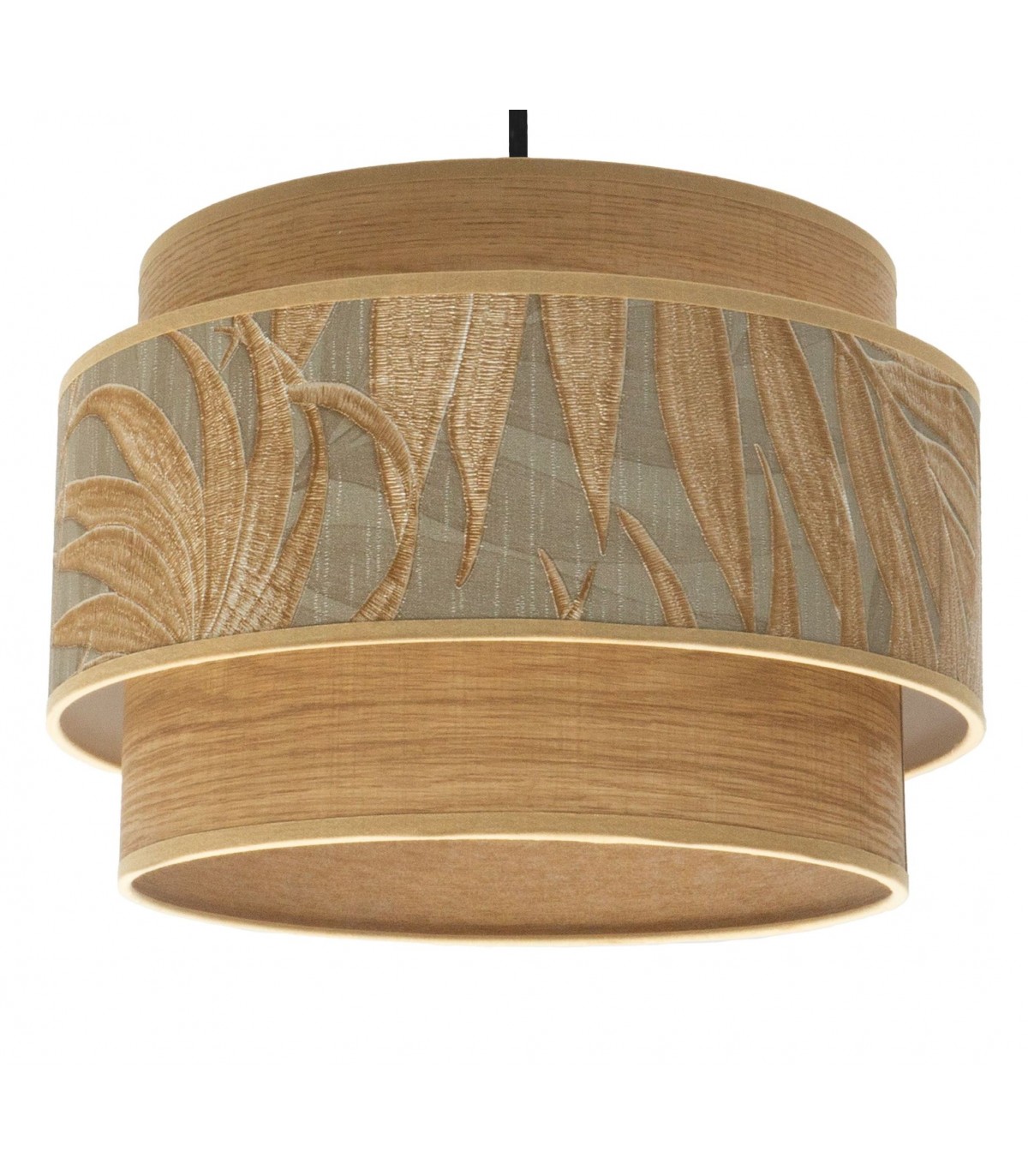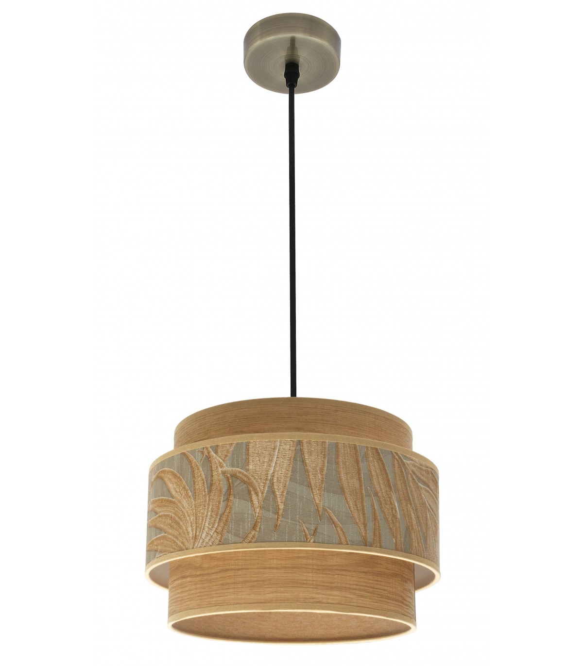 Lámpara de techo pequeña realizada en metal oro viejo y textil. Su pantalla se compone de dos cuerpos ribeteados, con un bonito estampado deco garden en su pantalla superior, combinando el efecto madera con plantas, resultando una composición muy vistosa y original. De estilo moderno, pero con líneas sencillas, idóneo para ambientes decorados con los nuevos estilos de decoración en los que se mezclan elementos naturales con plantas, conectando con la naturaleza y añadiendo a la estancia que iluminan frescura y vitalidad. Muy combinable con estilos Boho e Industriales modernos pero dando un toque de elegancia a dormitorios, entradas, pasillos, comedores y zonas de trabajo.