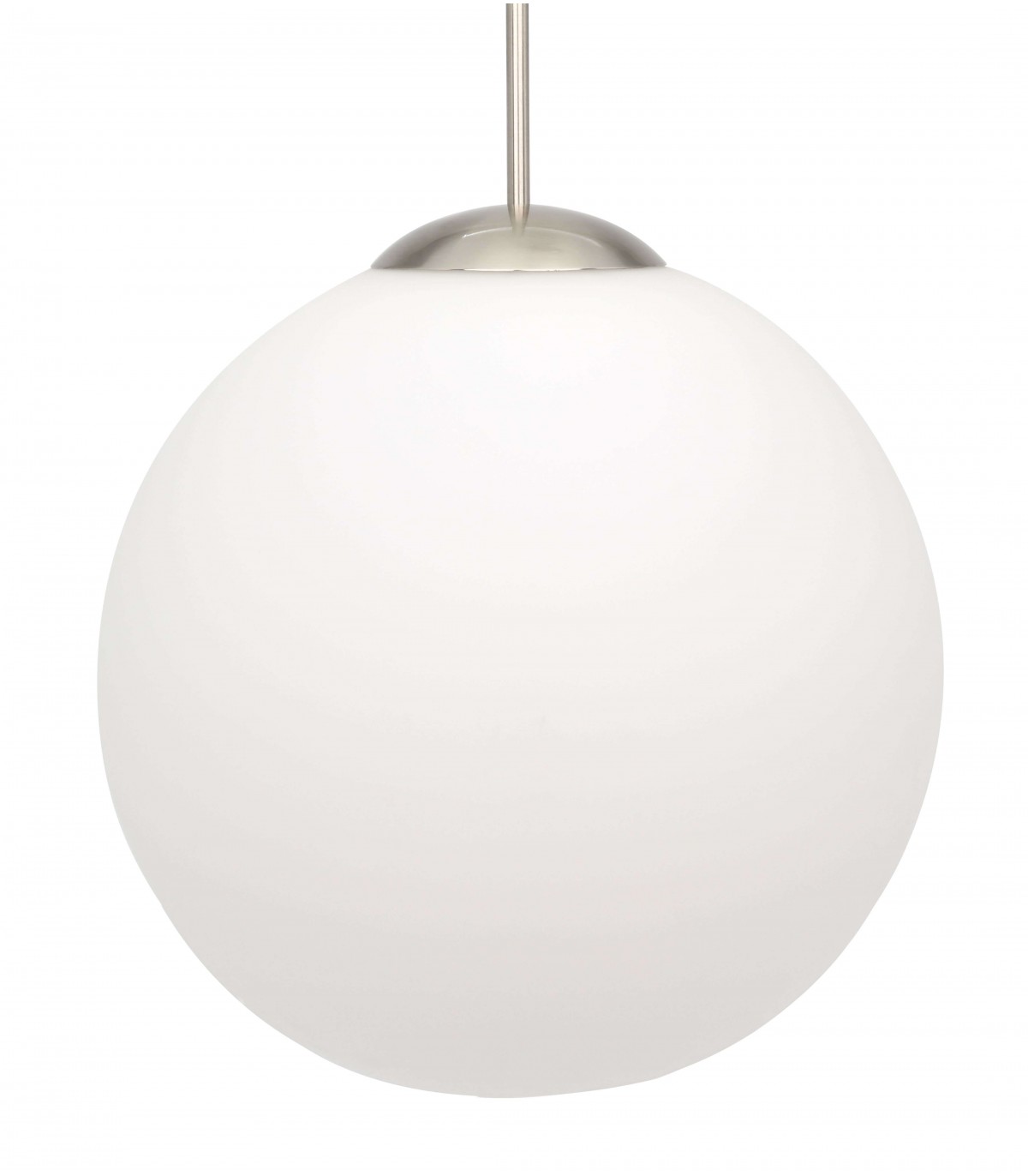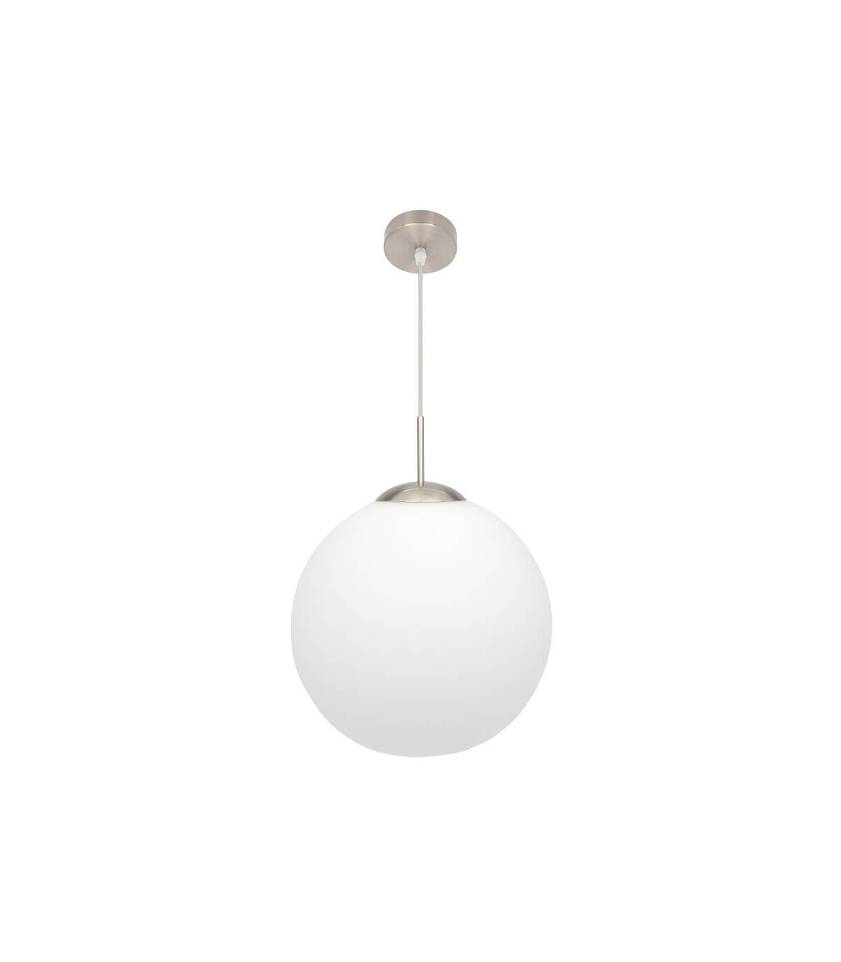 Lámpara de techo de diseño moderno, compuesta por una esfera de cristal blanco y metal cromado plata, regulable en altura perfecta para techos altos.