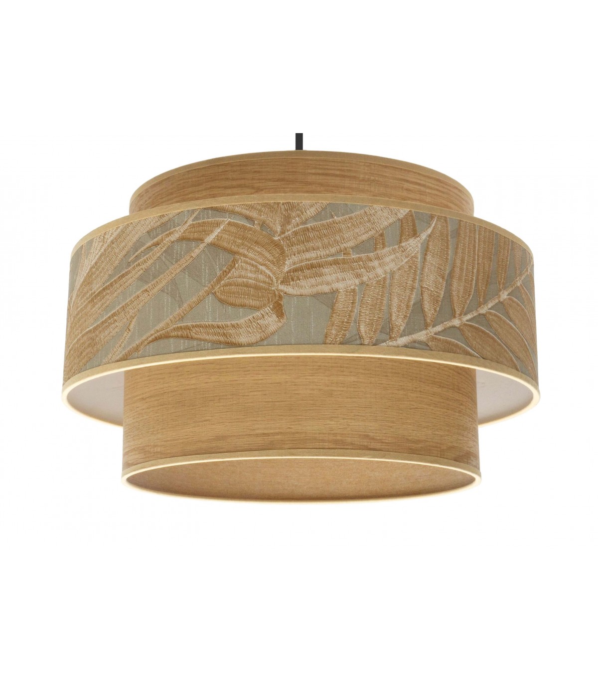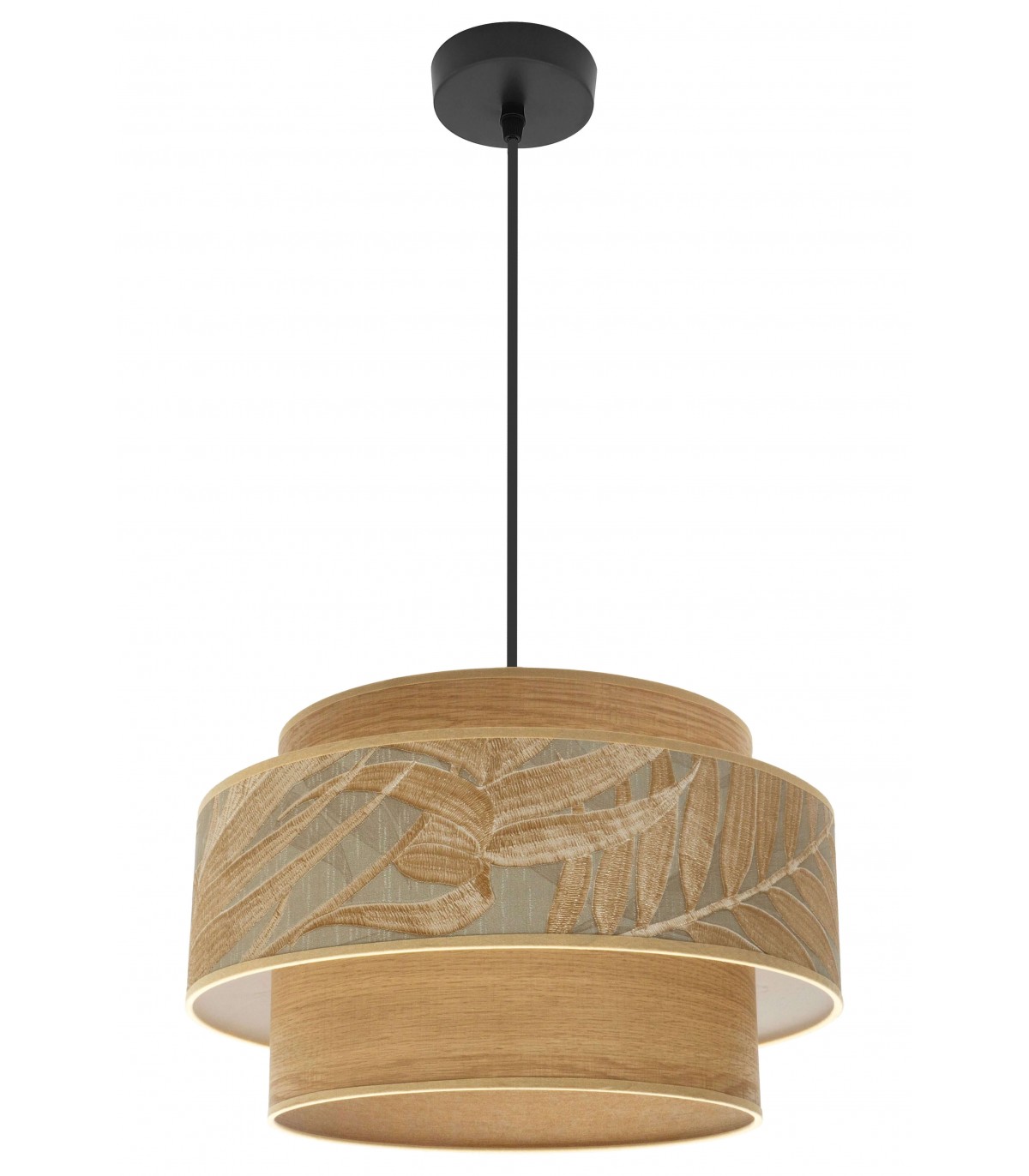 Lámpara de techo realizada en metal y textil. Su pantalla se compone de dos cuerpos ribeteados, con un bonito estampado decogarden en su pantalla superior, combinando el efecto madera con plantas, resultando una composición muy vistosa y original. De estilo moderno, pero con líneas sencillas, idóneo para ambientes decorados con los nuevos estilos de decoración en los que se mezclan elementos naturales con plantas, conectando con la naturaleza y añadiendo a la estancia que iluminan frescura y vitalidad. Muy combinable con estilos Boho e Industriales modernos pero dando un toque de elegancia a dormitorios, entradas, pasillos, comedores y zonas de trabajo.