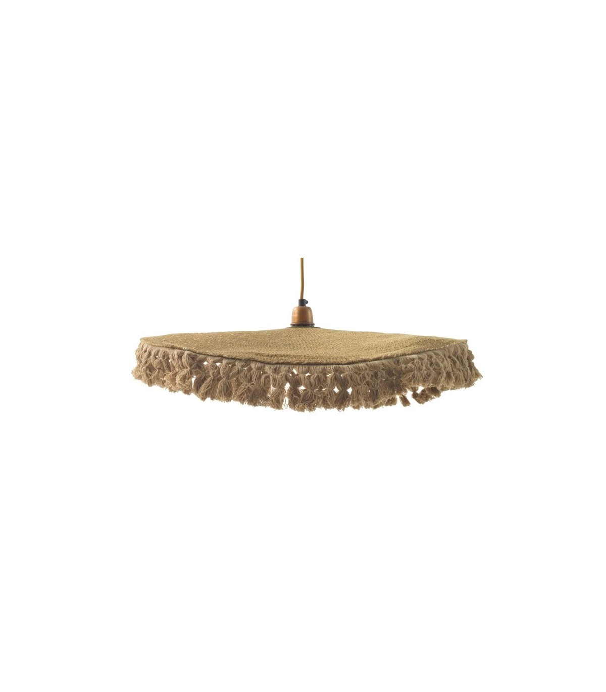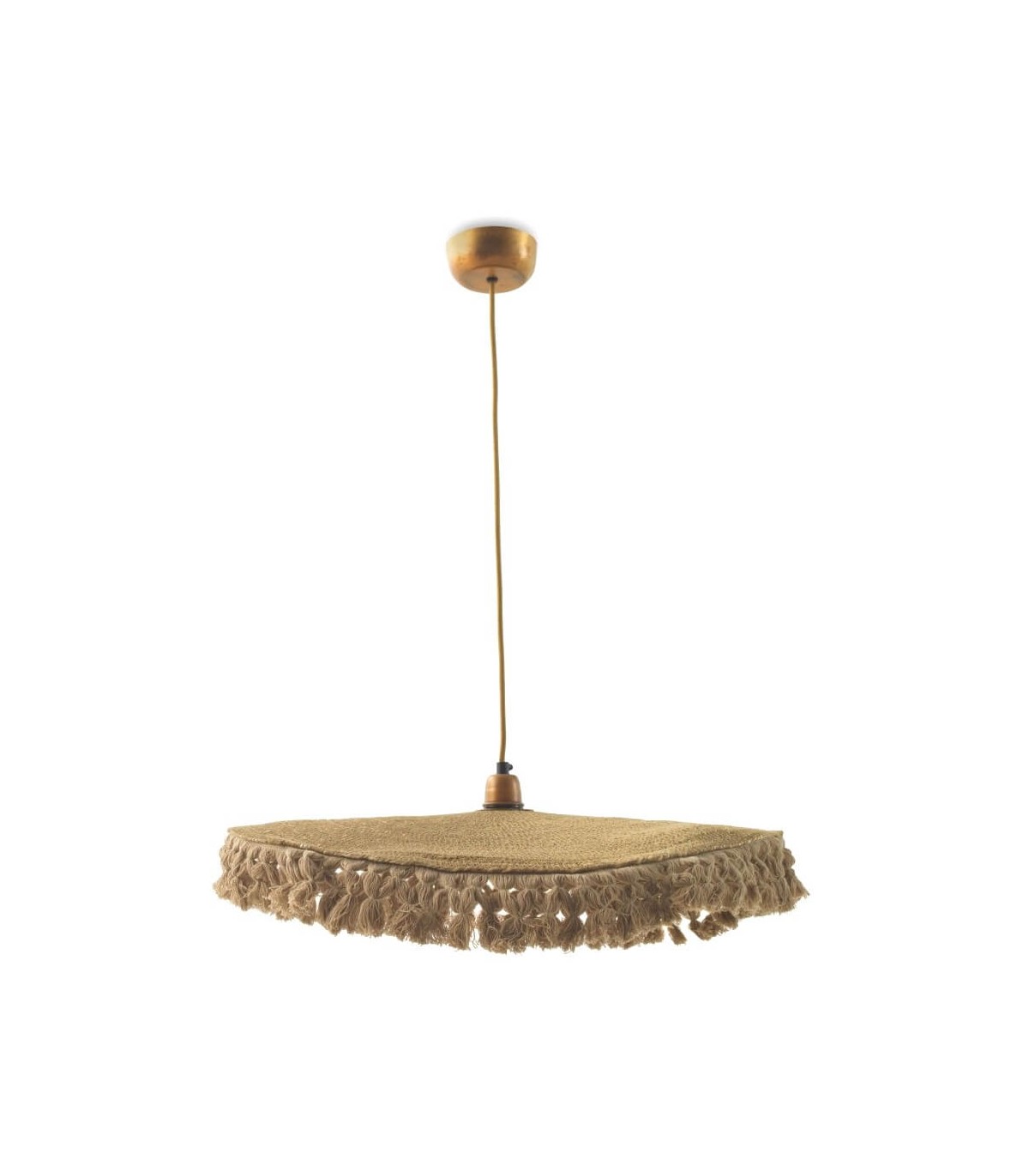 Acabado, artesanal, fibra natural acabado natural, cable en textil trenzado color oro, florón metal oro viejo.