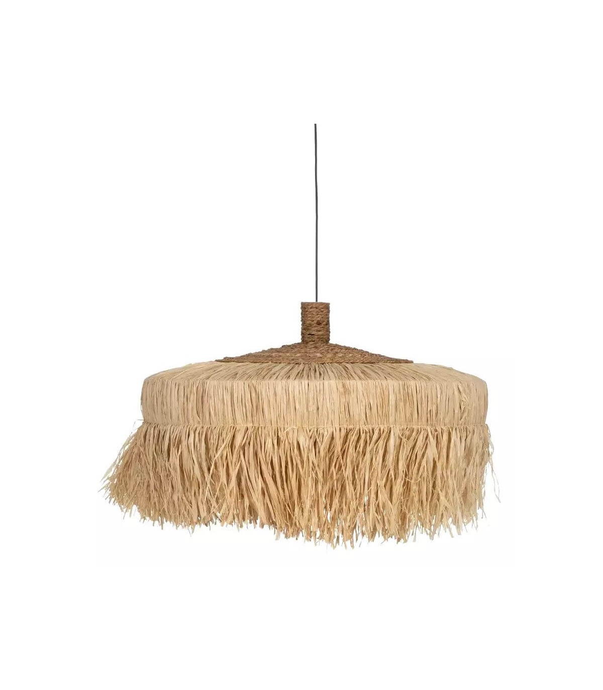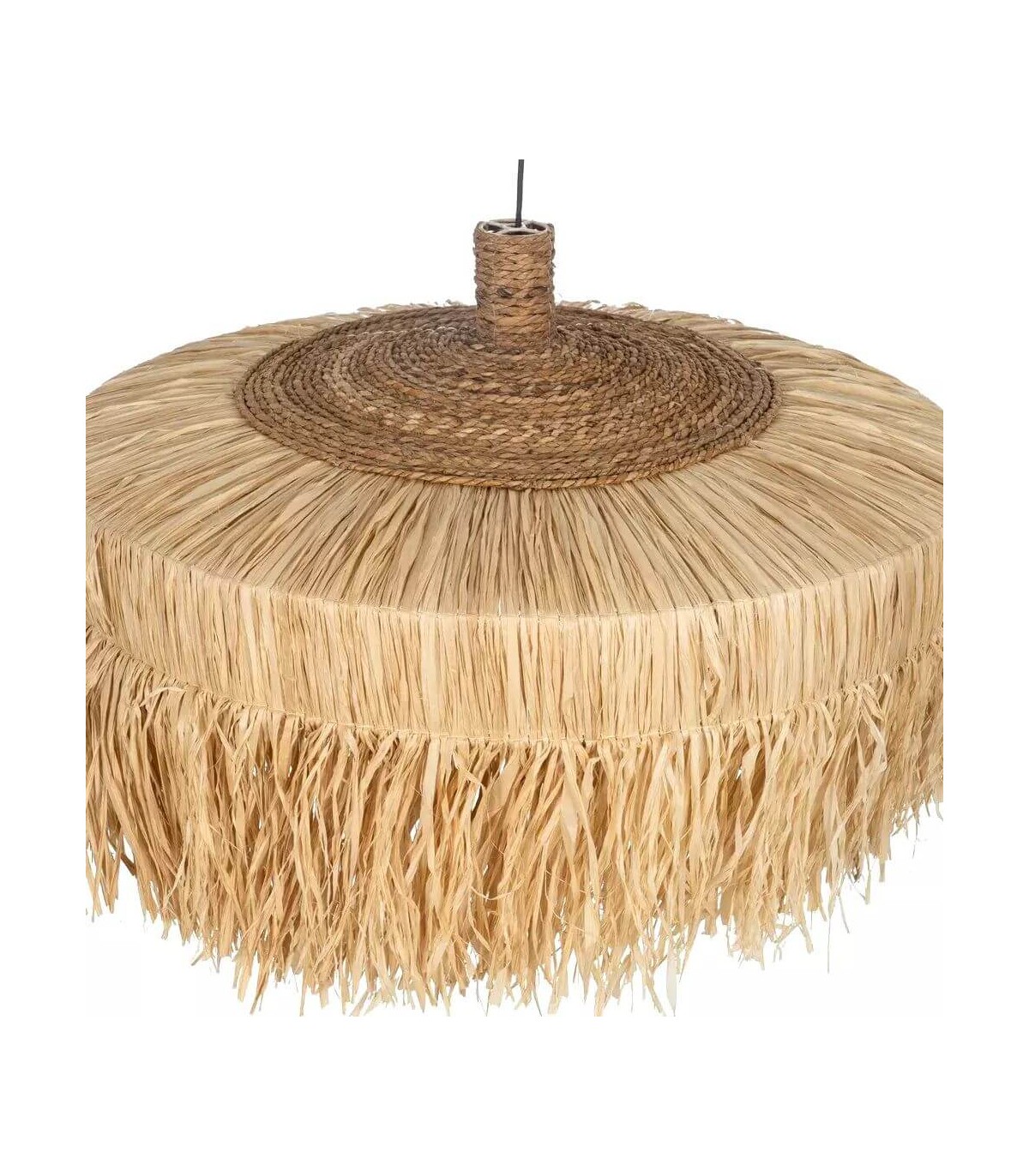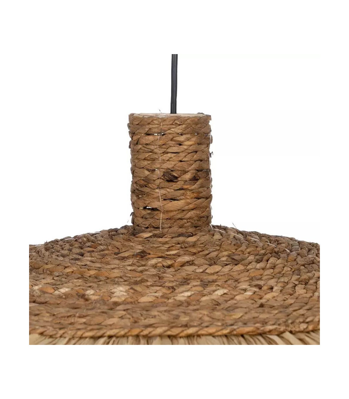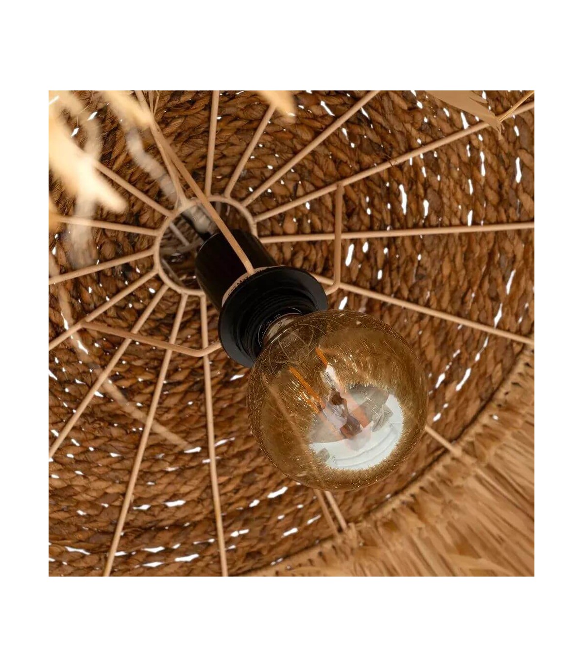 Acabado, artesanal, fibras naturales trenzadas a mano, florón del techo y cable negro.