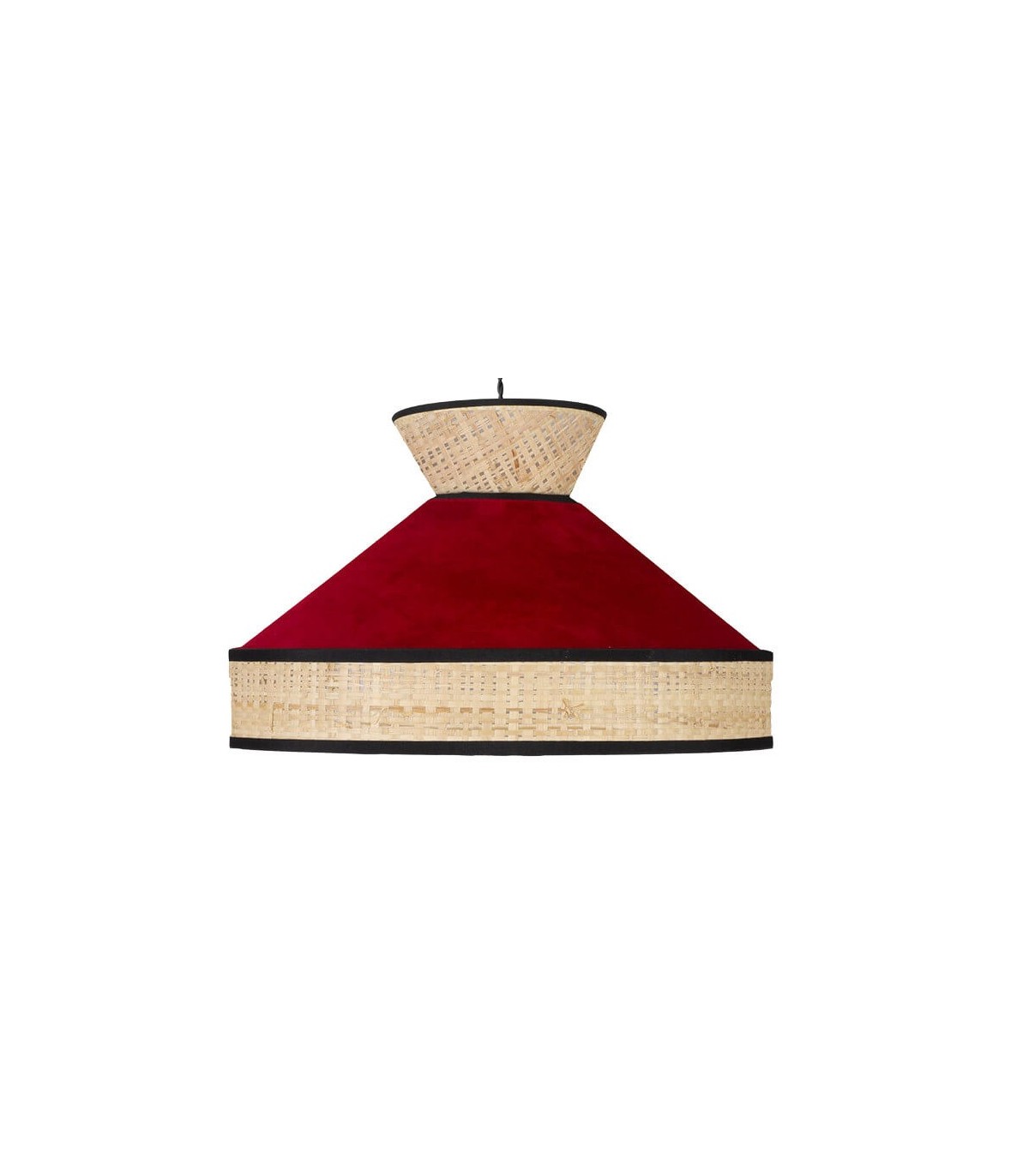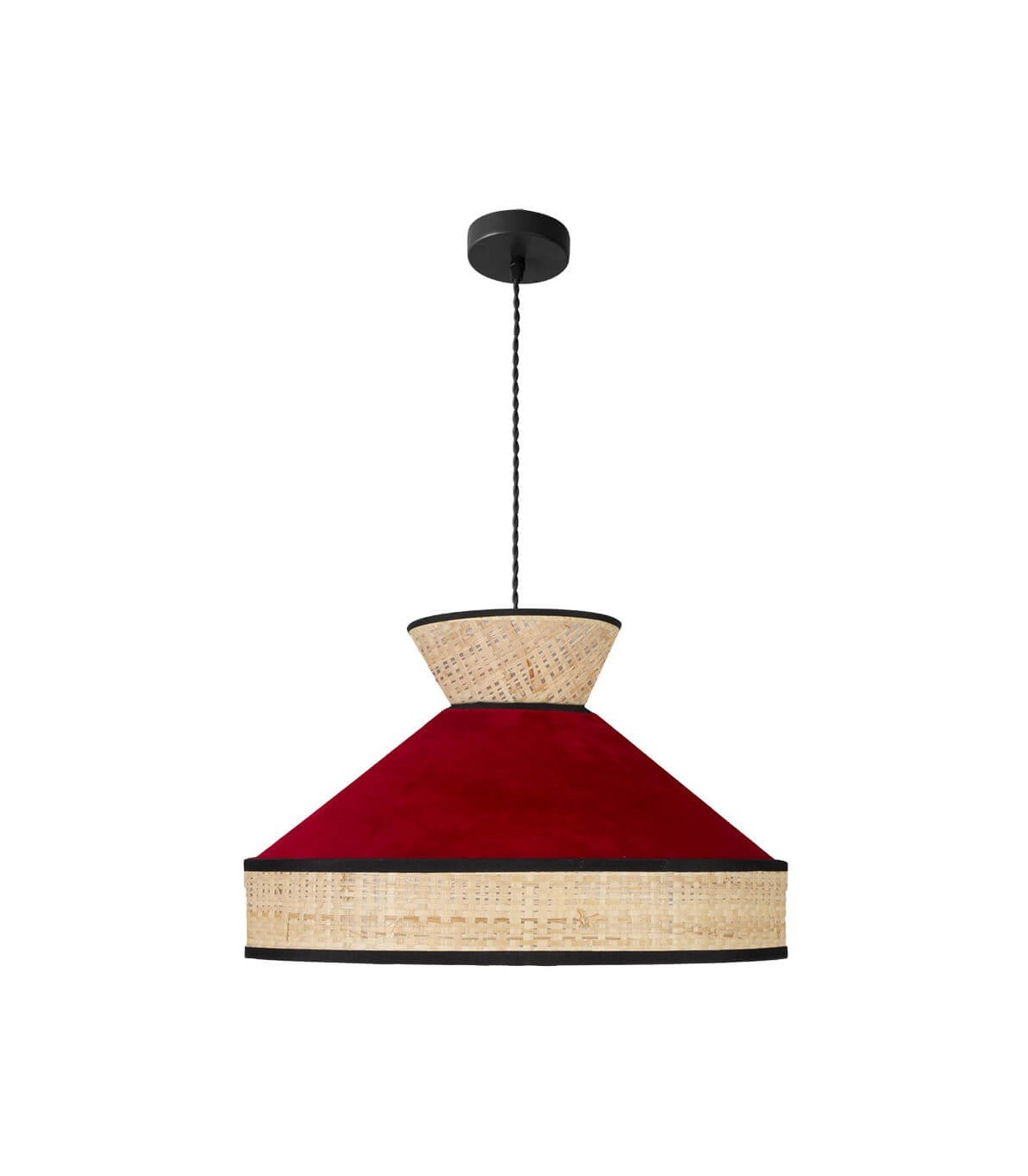 Lámpara de techo de la serie Fabrizio de color natural y rojo ribeteada con cinta y pendel en negro. Realizado en material textil y metal. Pantalla moderna de diseño muy original, tanto por su forma, como por la combinación de colores y texturas de sus tejidos, mezclando el terciopelo con rafia natural, resultando una composición única para decorar cualquier rincón o estancia, poniendo siempre un toque de color. Disponible en varios colores y tamaños.
