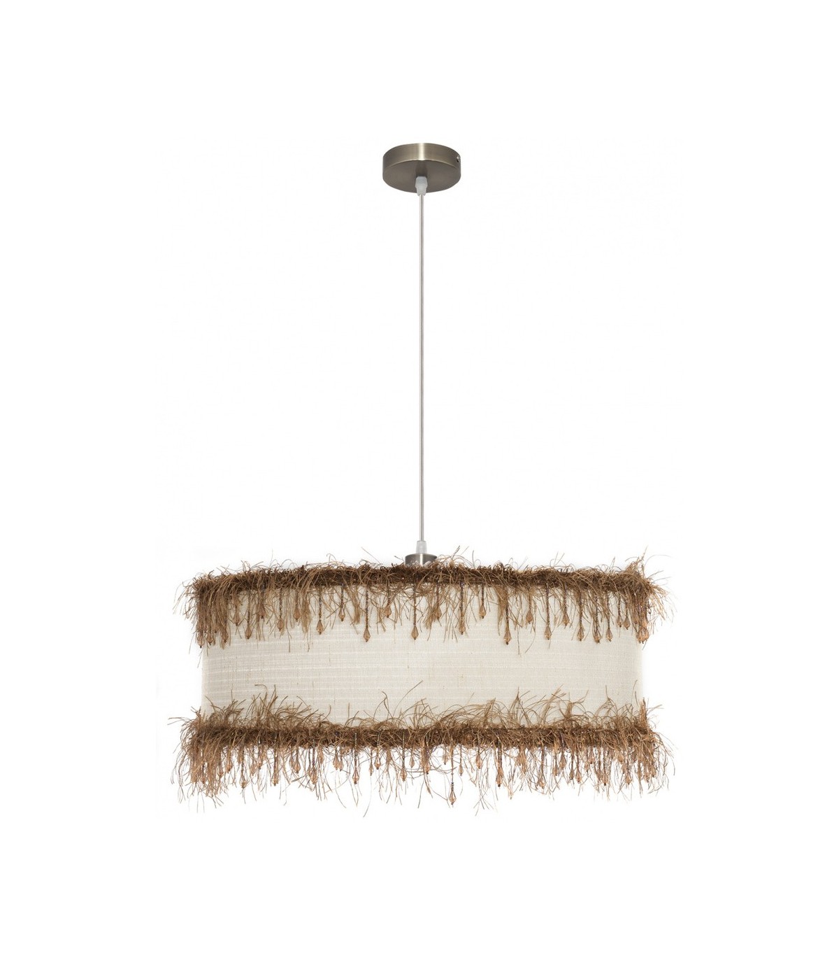 Colgante serie Hilos de color beis. Este moderno colgante se caracteriza por una decoración de pasamanería de color ocre. Pantalla y armazón componen un conjunto perfecto para ambientar espacios con cierto toque vintage. Posee un portalámparas E27 y su diámetro es de 50 centímetros. Se puede completar la serie con el colgante de 40 cm y el sobremesa a juego.