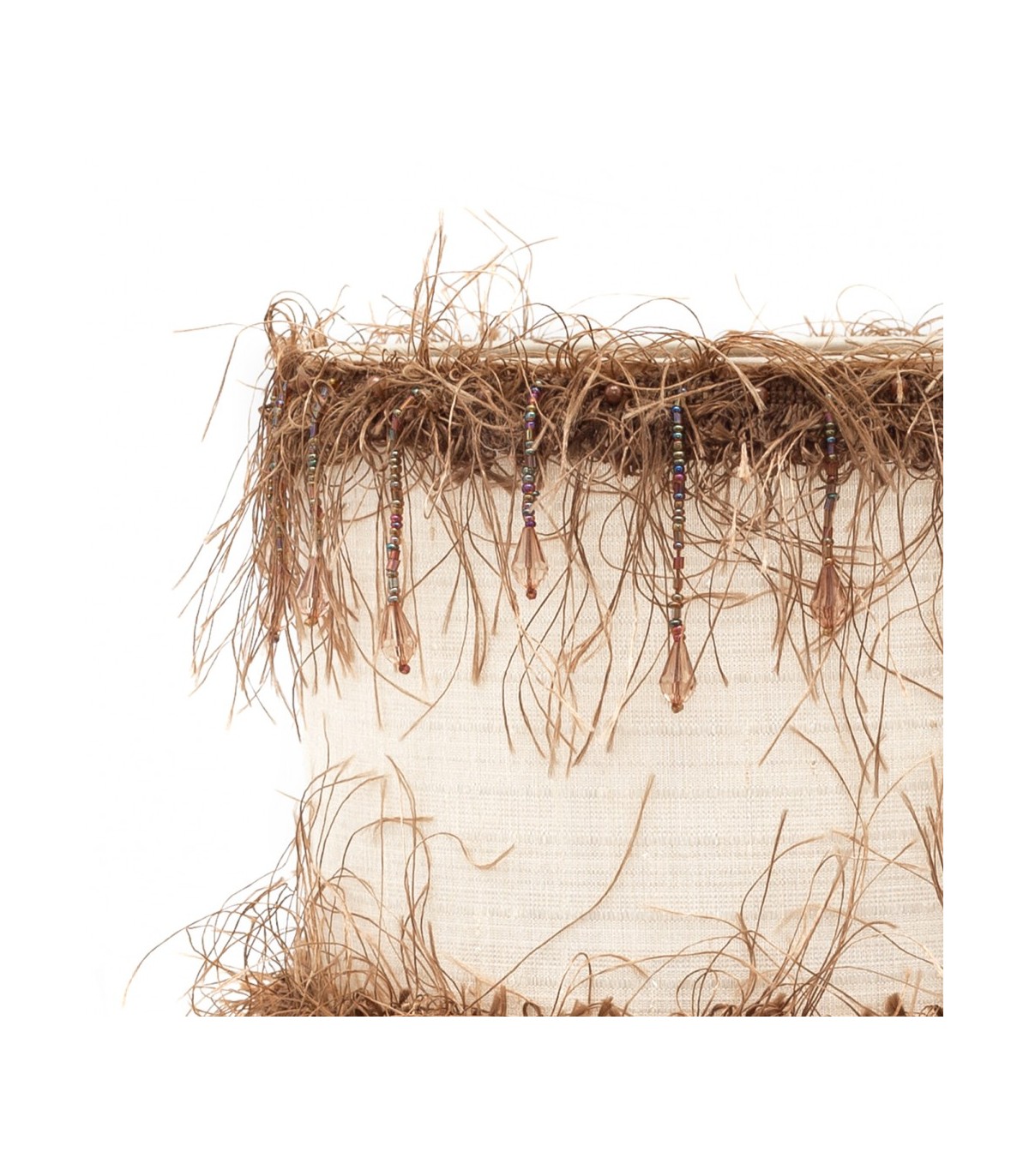Acabado, metal oro viejo, textil color beige, hilos, filigranas y cuentas color marrón.