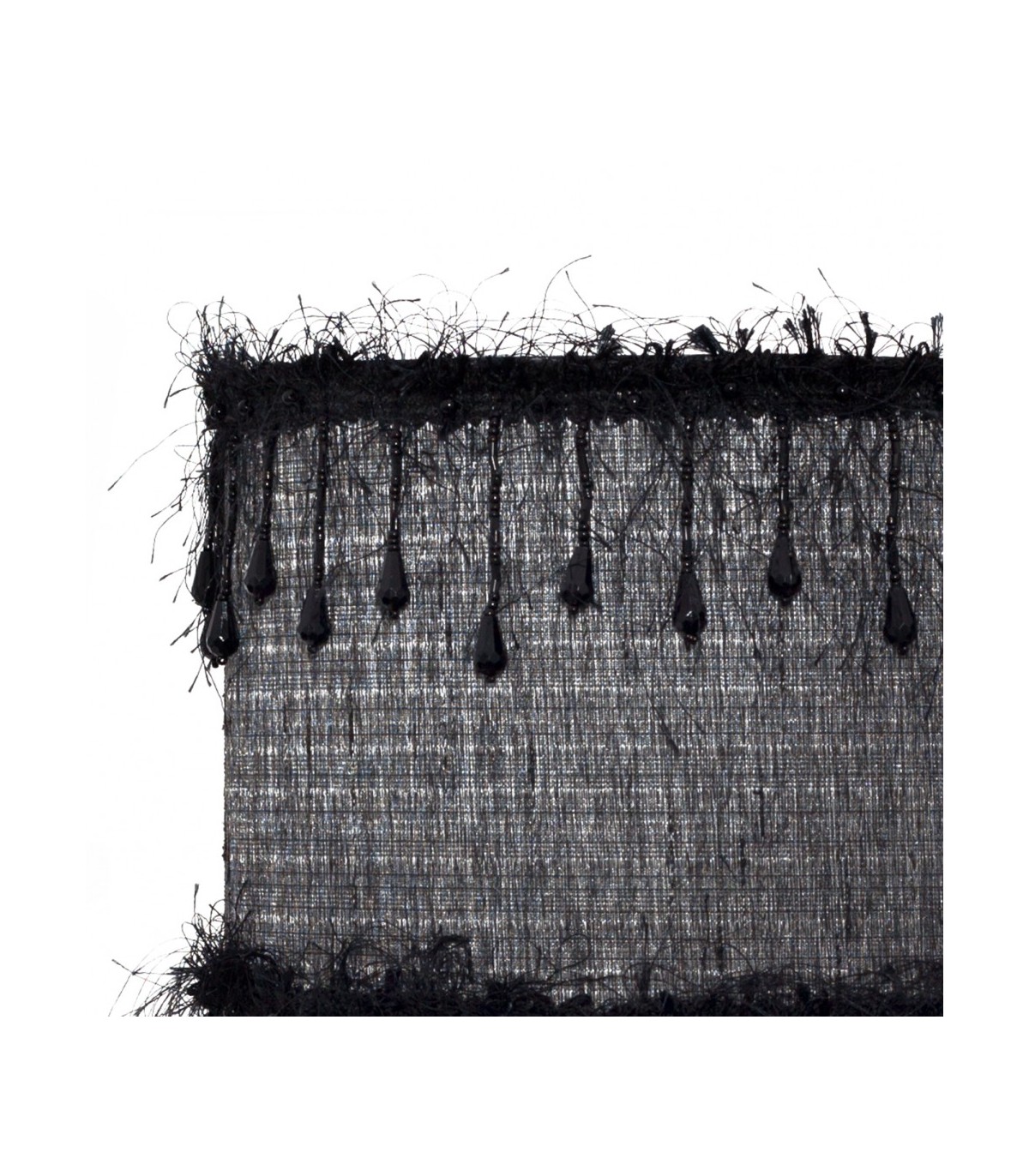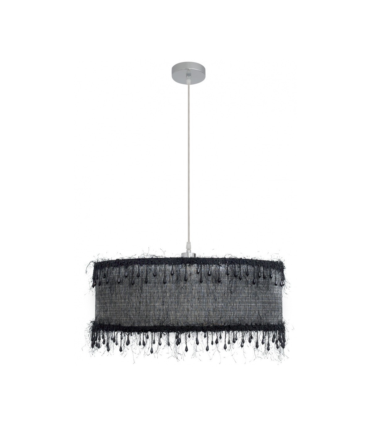 Colgante serie Hilos de color negro. Este moderno colgante se caracteriza por una decoración de pasamanería de color negro. Pantalla y armazón componen un conjunto perfecto para ambientar espacios con cierto toque vintage. Posee un portalámparas E27 y su diámetro es de 50 centímetros. Se puede completar la serie con el colgante de 40 cm en color negro y el sobremesa a juego.