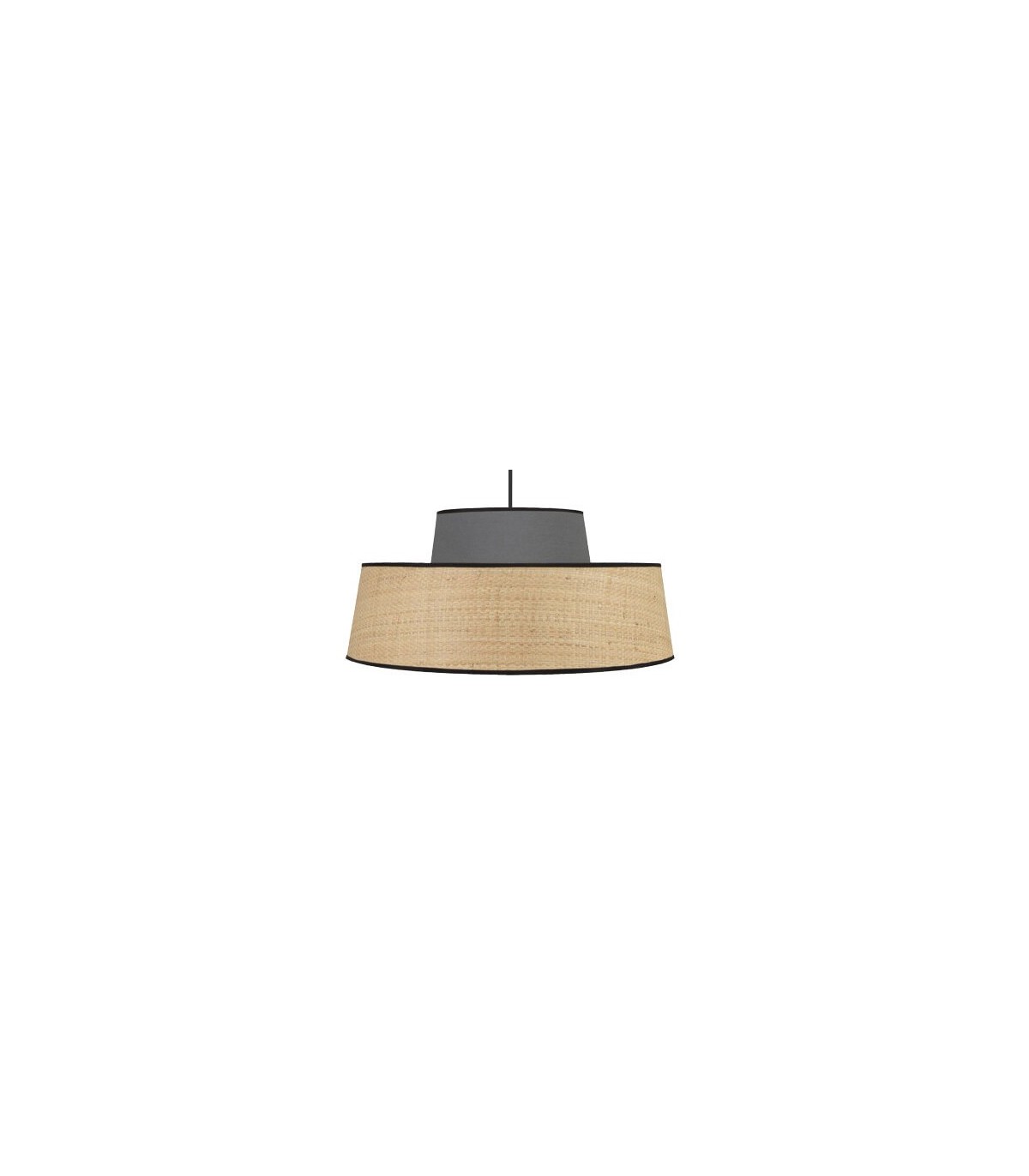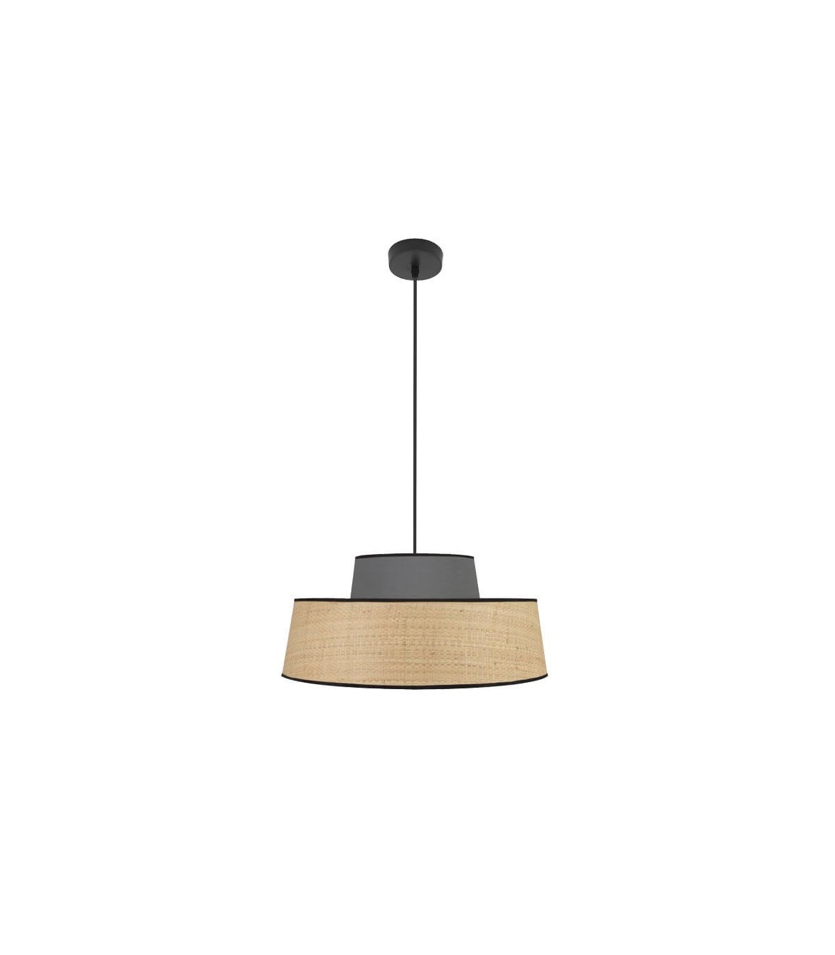 Acabado, textil imitación ratán y gris, cable y rosetón negros.