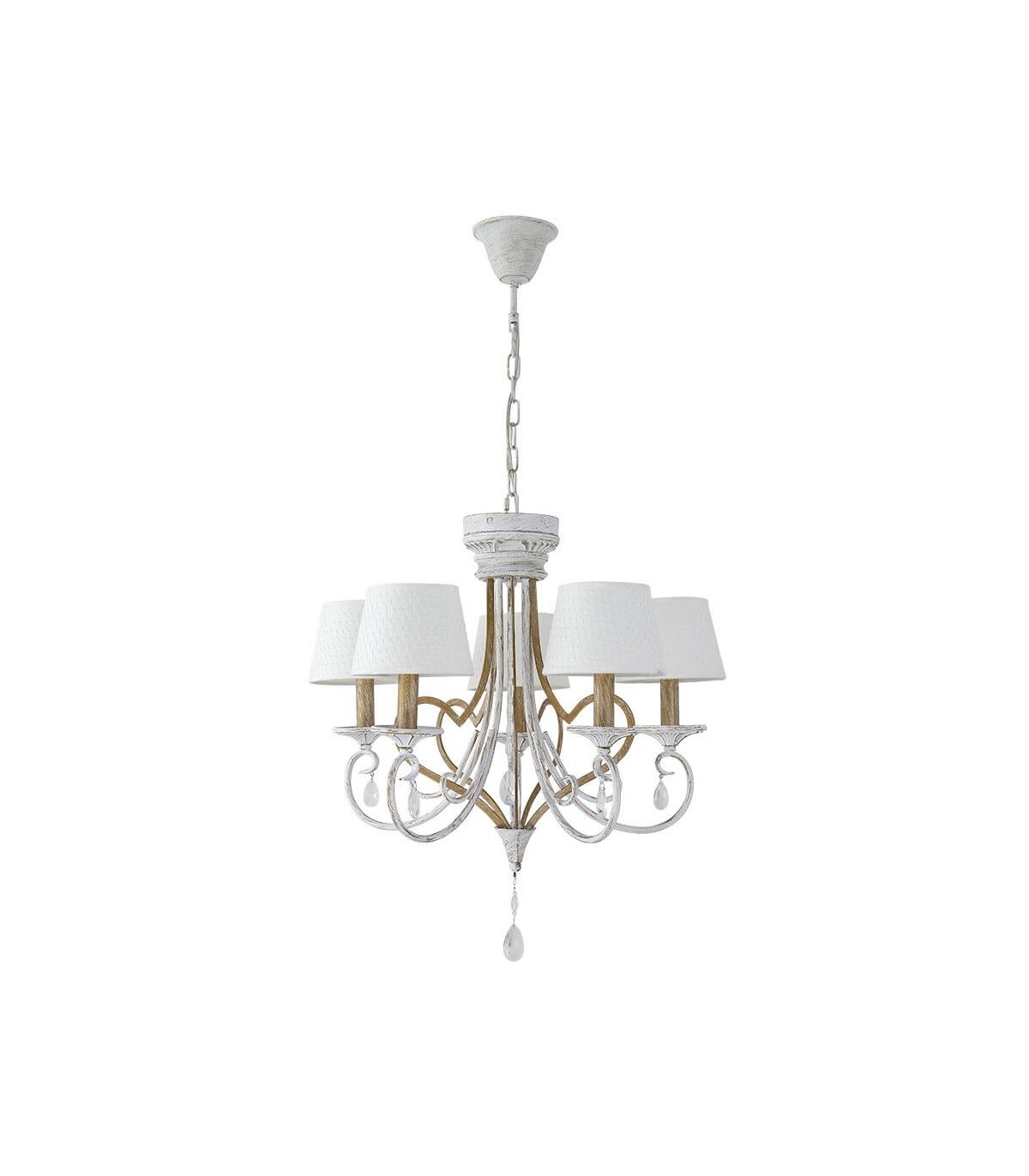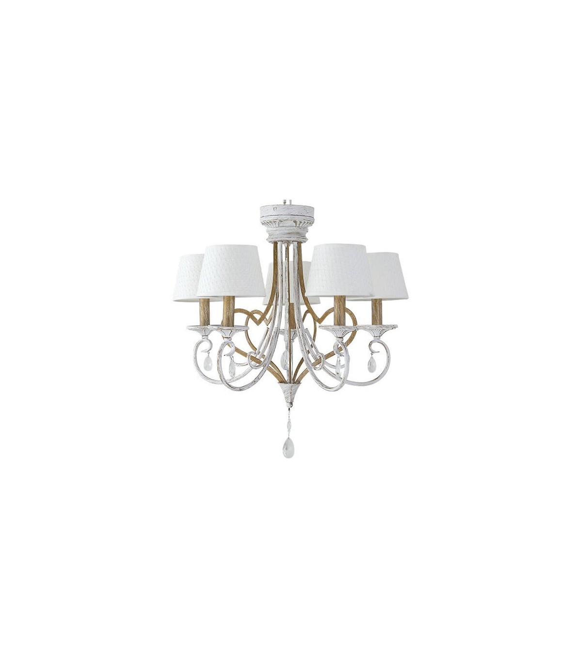 Lámpara de techo realizada en metal pintado, con lágrima de cristal y material textil. Bonito y original diseño diferenciándose dos cuerpos, uno dorado y otro en decapé con lágrimas de cristal. También destacan sus pantallas simulando un tejido de algodón grueso, observándose cómo se entrelazan sus hilos. Con doble florón, posibilitando colgar la lámpara sin cadena, para colocar en dormitorios de techo bajo o abuhardillados. Composición muy decorativa y elegante de estilo clásico pero acorde con el nuevo estilo Vintage, ideal para decorar salones, comedores, dormitorios y salas de estar.