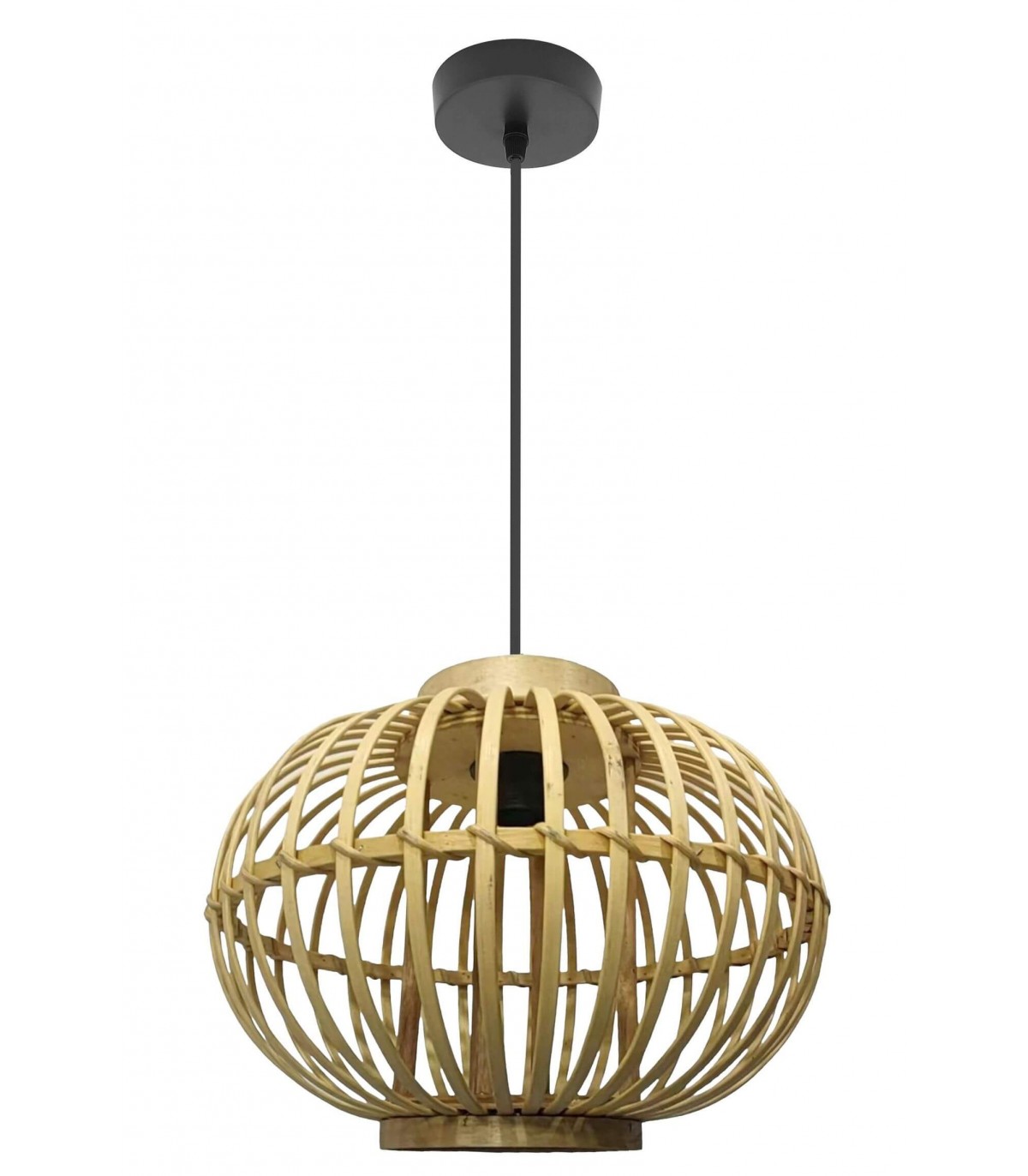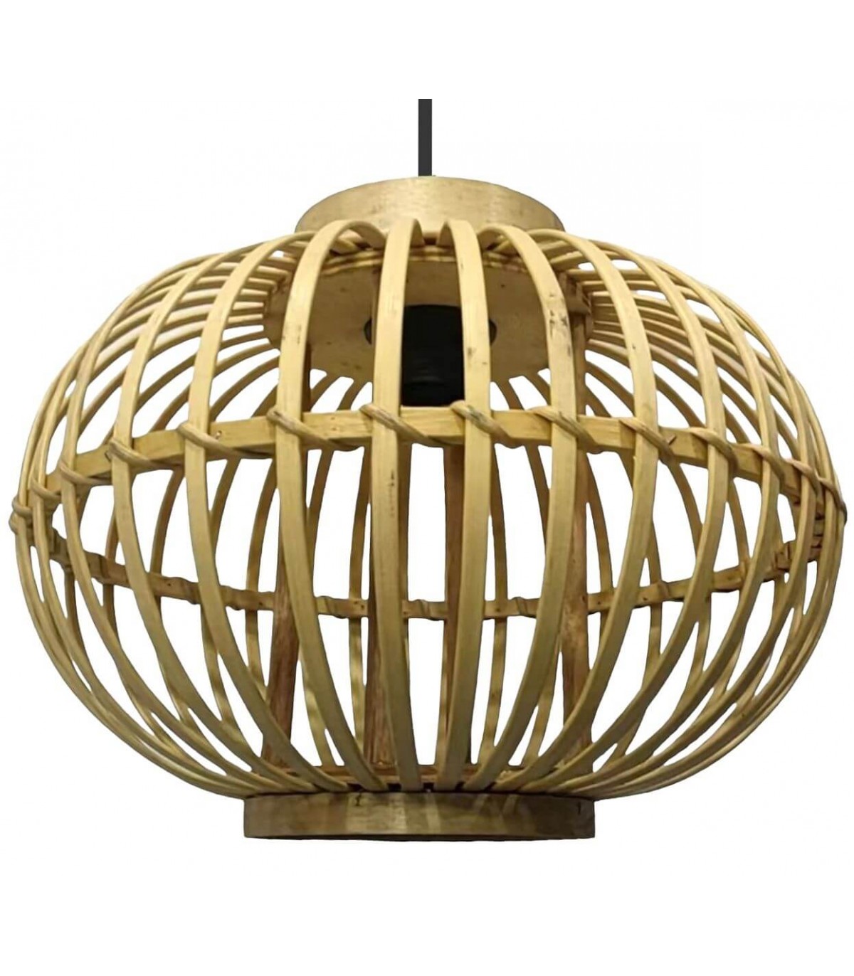 Lámpara de techo, realizada en bambú natural. Se compone de un armazón de bambú inspirado en un farol oriental, caracterizado por sus formas sencillas, el bambú es un material flexible pero duradero y aporta un ambiente natural. Ideal para estancias decoradas en en el nuevo estilo vintage rústico o minimalista. La luz que pasa por su estructura crea un ambiente cálido y acogedor, también característicos de las zonas mediterráneas avocadas al descanso y la meditación, utilizándose también este estilo para relajar salones, dormitorios, comedores y zonas de trabajo.