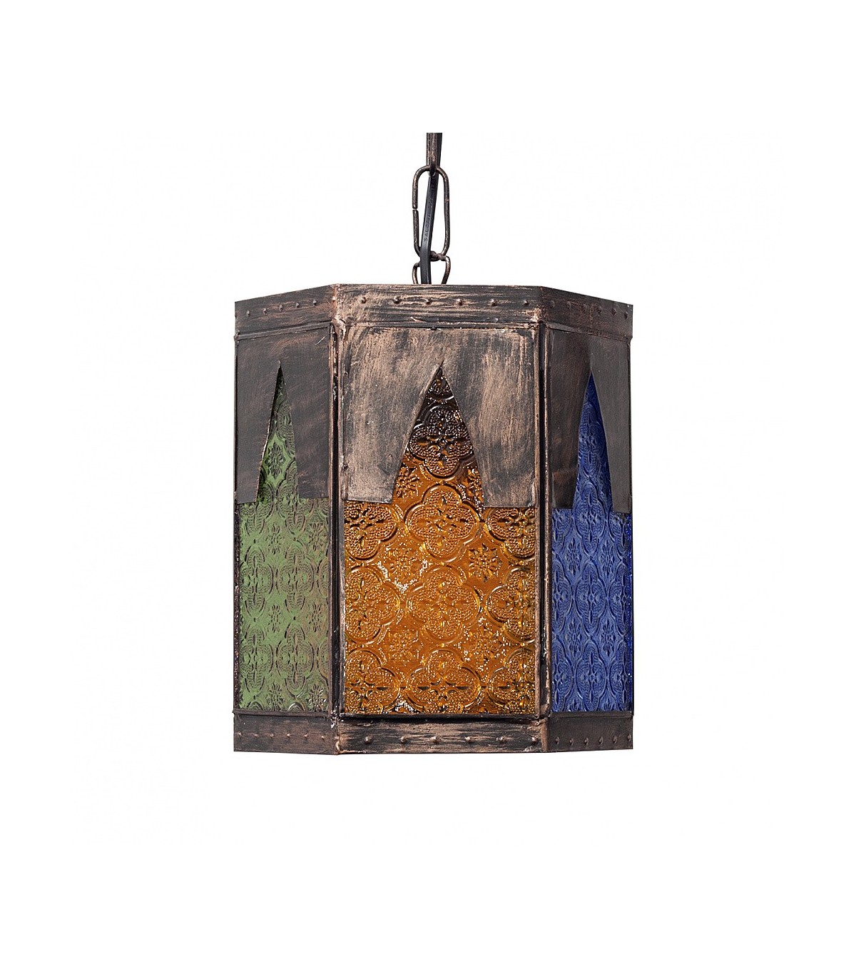 Lámpara de techo serie Mek de color marrón. Realizado en metal y cristal de colores con relieves. Su diseño está inspirado en el arte marroquí. Los cristales de color le aporta variedad lumínica.