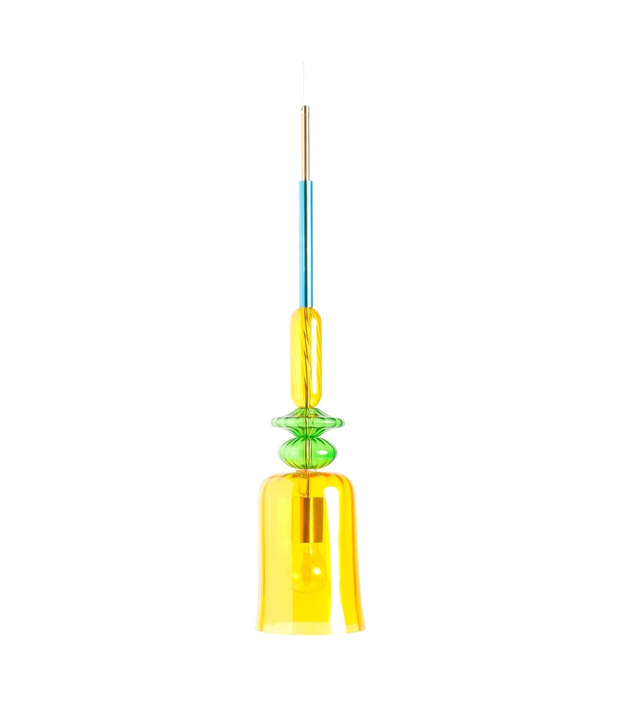 Lámpara de techo de estilo art decó, una lámpara muy decorativa, realizada en metal dorado y cristal labrado artesanalmente en amarillo verde y azul, se puede regular la altura.