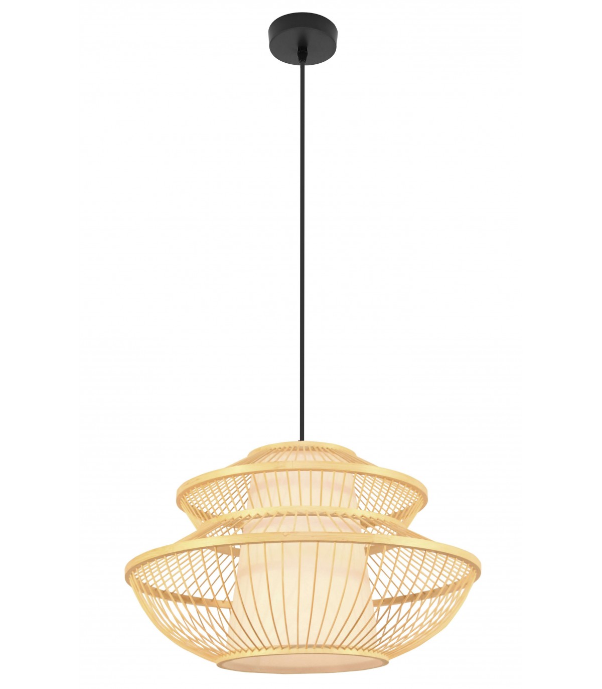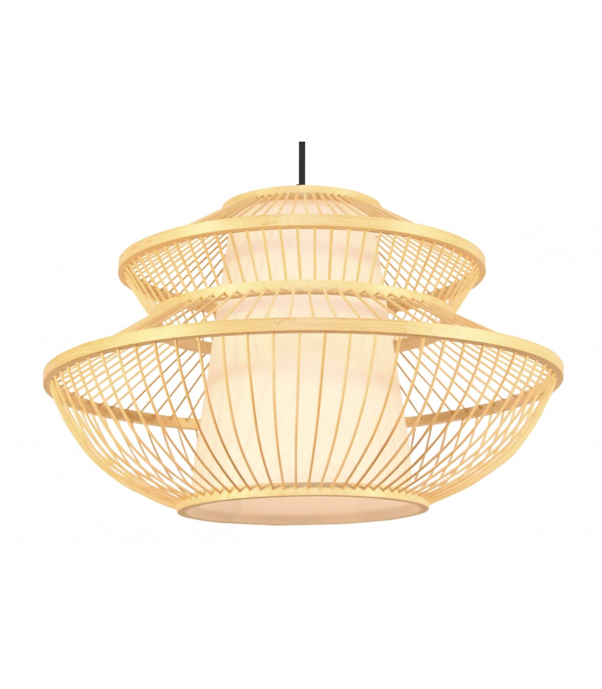 Lámpara de techo, realizada en metal, bambú y pergamino. Se compone de un cuerpo de bambú inspirado en un farol japonés, caracterizado por sus formas sencillas, de color natural y duradero. De diseño original y elegante acorde con varios estilos de decoración como el minimalista, nórdico u oriental. La disposición de sus varillas y la pantalla de pergamino que se observa en su interior, difumina la luz creando un ambiente cálido y acogedor, también característicos de las zonas mediterráneas avocadas al descanso y la meditación, utilizándose también este estilo para relajar zonas de trabajo y hogares.
