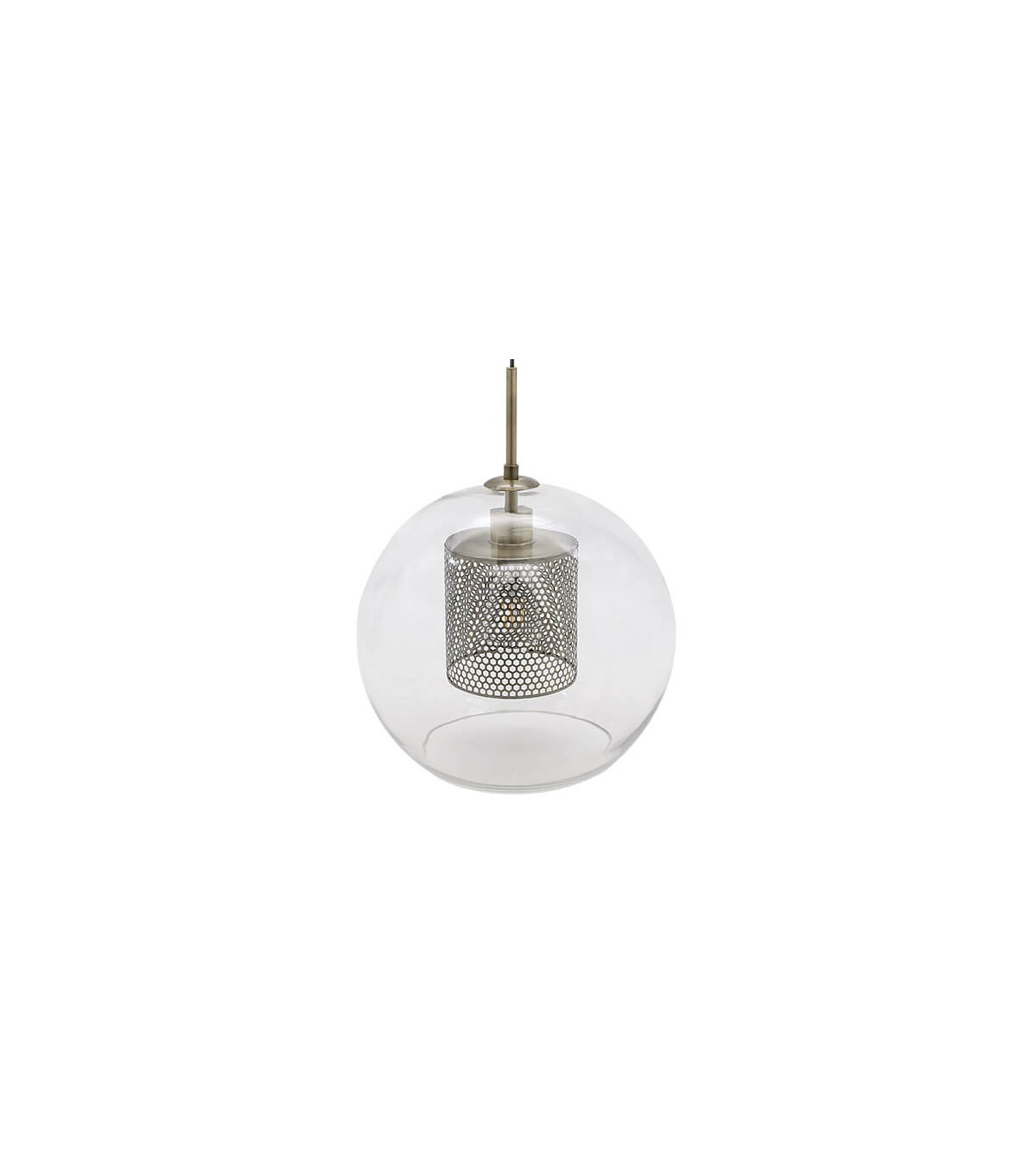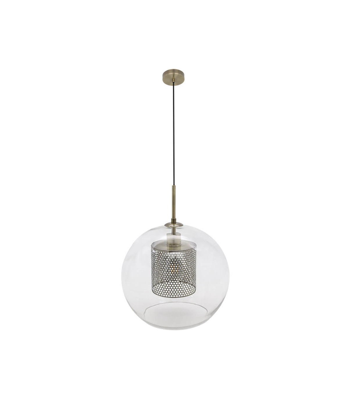 Lámpara de techo realizada en metal y cristal en color CUERO. De diseño moderno y original, resaltando la tulipa de rejilla metálica que se aprecia en el interior de su tulipa de cristal transparente. Estos colgantes dan juego a la hora de poder realizar composiciones diferentes con varios colgantes iguales o de diseños distintos de esta misma serie, dando un toque exclusivo, elegante y sofisticado para decorar en dormitorios, comedores, salones y salas de estar. Ideal para estancias decoradas con los nuevos estilos de decoración, en el que se mezclan texturas y materiales diferentes, dando lugar a decoraciones Vintage y Boho Chic.