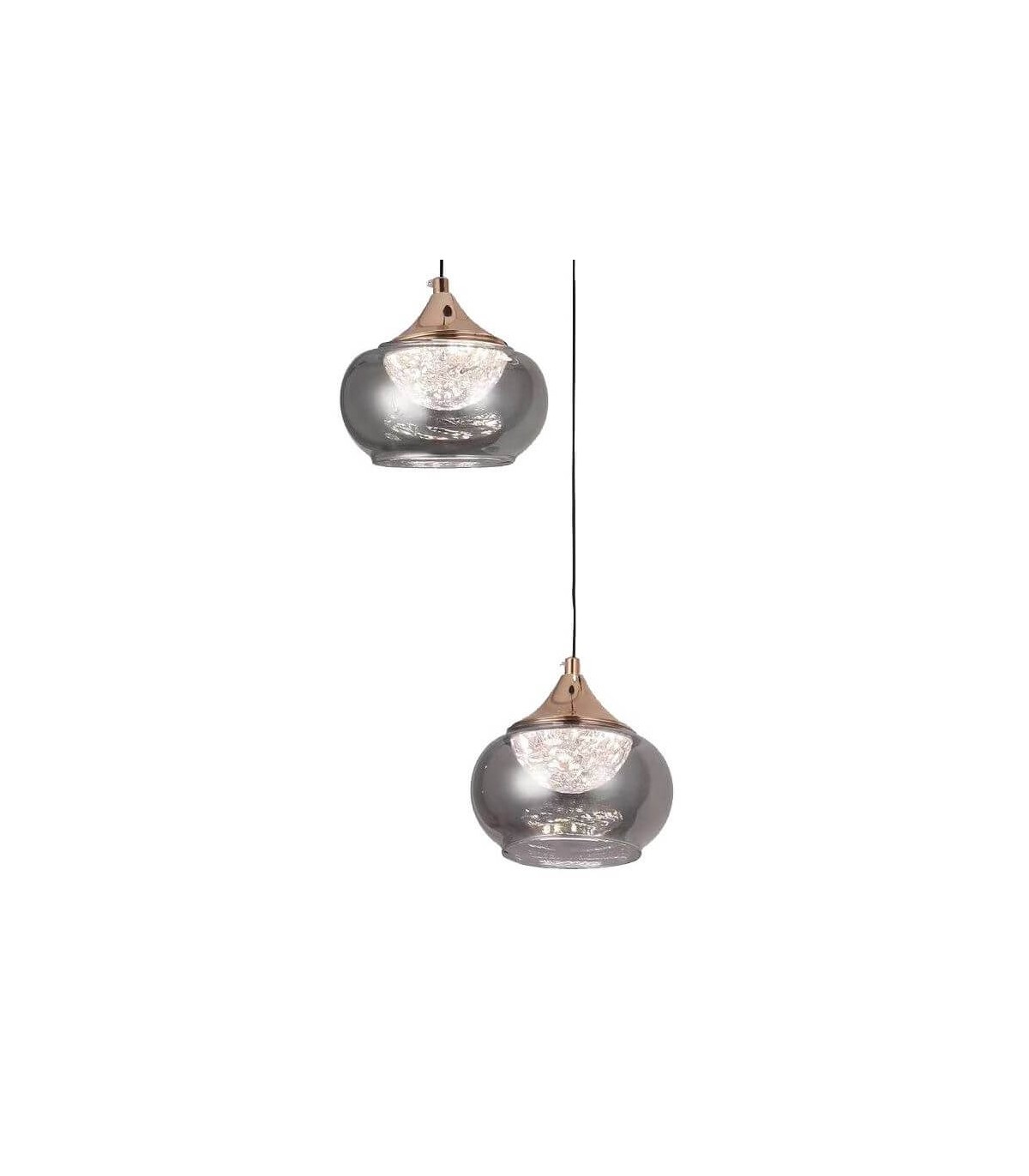 Lámpara de techo Realizada en metal y cristal. Destacan sus tulipas que presentan un diseño muy original y moderno, con cristal fumé transparente dejando apreciar la colmena de luces LED de su interior. Sus tulipas se encuentran suspendidas en disposición circular creando así una composición muy decorativa.
