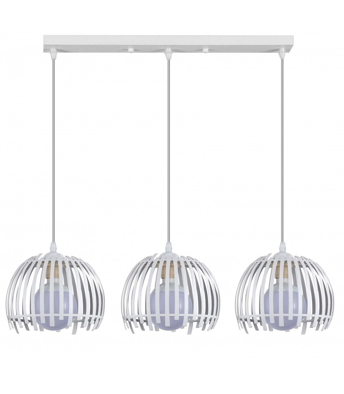 Lampara de techo con 3 pantallas realizadas en metal blanco regulables en altura individualmente, La luz pasa a través de los huecos de sus tulipas describiendo un juego de luces muy decorativo ideal para salones y salas de estar e incluso para zonas de trabajo decoradas con diversos estilos de decoración, como pueden ser el Industrial o el Vintage Rústico, tomando parte importante de la decoración.